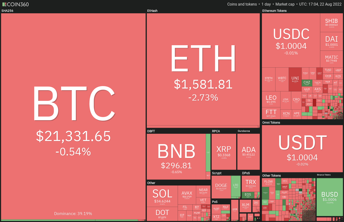 A minor positive is that the long tail on the Aug. 22 candlestick shows that bulls are attempting to defend the support line with vigor. If bulls push the price above $21,800, the BTC/USDT pair could rise to the 20-day exponential moving average (EMA) ($22,725).