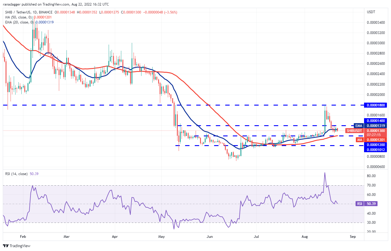 Shiba Inu (SHIB) is witnessing a tussle near the 20-day EMA ($0.000013) with both the bulls and the bears vying for supremacy. The buyers are attempting to push the price above the overhead resistance at $0.000014 but the bears have held their ground.