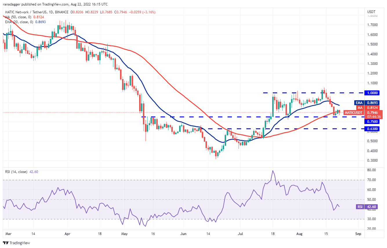 If bulls push the price above the 20-day EMA ($0.86), the MATIC/USDT pair could attempt a rally to the overhead resistance at $1 where the bears are likely to mount a strong defense. If the price turns down from this resistance, the pair could extend its stay inside the range for some more time.
