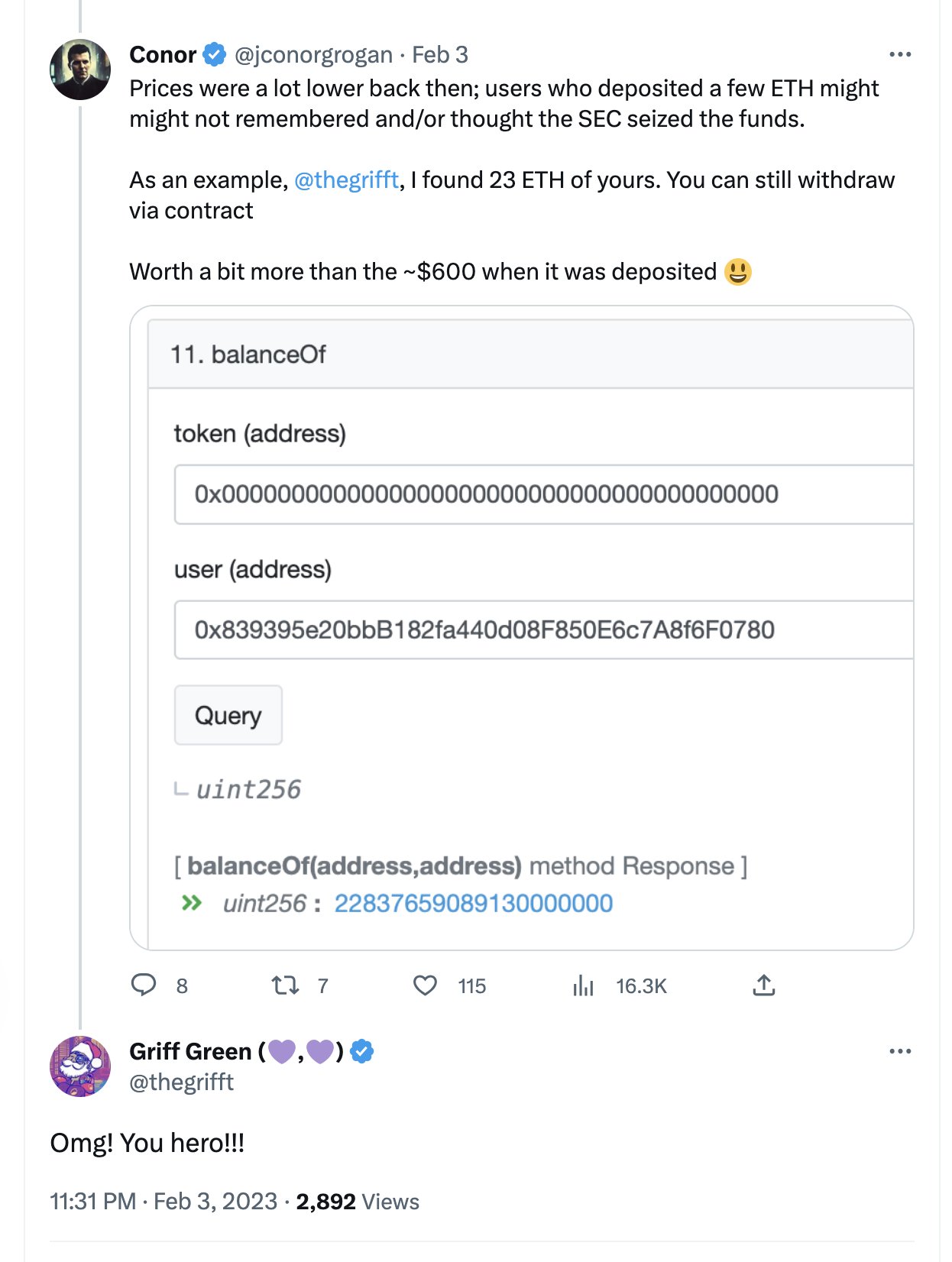 “Forgetting you have funds on chain (or not keeping track of airdrops) is common,” Grogan said, sharing how he’d recovered six-figure amounts for investors in the past. In a subsequent screenshot, Grogan said he once notified a Twitter user of 23 ETH that had been sitting untouched.