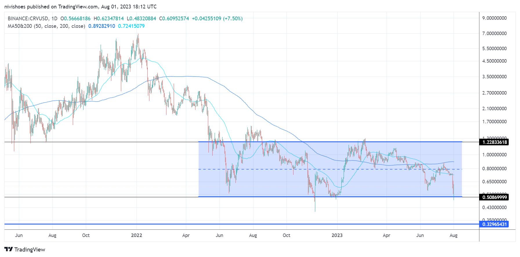 The CRV/USD pair is trending near multi-year lows at around $0.50. If buyers are able to build support at this level, the price can rally in the short to medium term toward the horizontal resistance levels at $0.78 and $1.23.