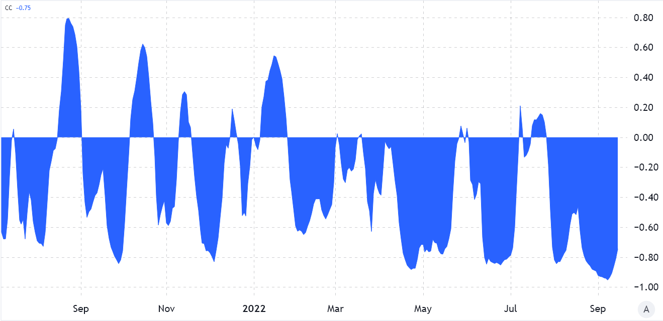 The metric has been below negative 0.6 since Aug. 19, indicating that both DXY and Bitcoin have generally followed an inverse trend. In fact, the longest-ever period of inverse correlation has been April 14 to May 20.