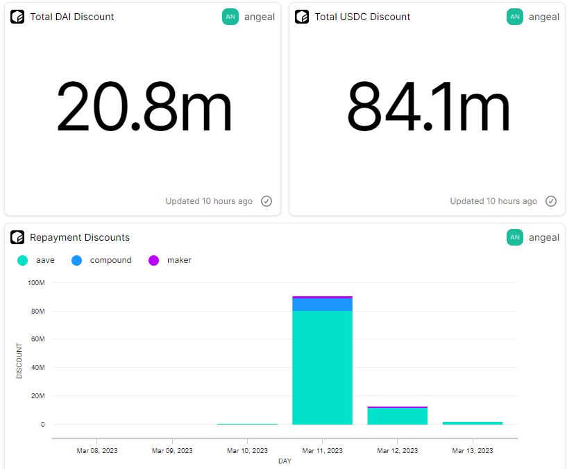 Blockchain analytics firm Flipside Crypto estimates that USDC debtors saved $84 million as a result of paying back loans while the stablecoin was de-pegged, while those using DAI saved $20.8 million.
