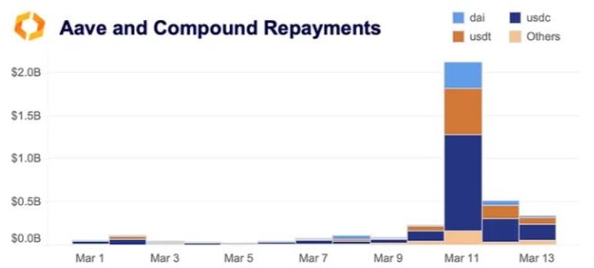 This tapered off as both USDC and DAI started heading back toward their peg. The following days did not have anywhere near as many repayments, with a rough total of only $500 million in loan repayments across Tether (USDT), USDC, DAI and other coins on March 12, and roughly half of that on March 13.