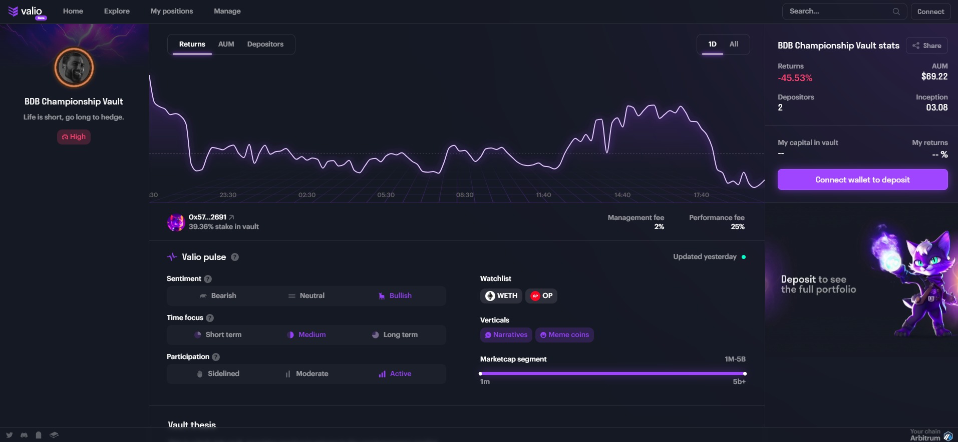 All assets are held in smart contracts and cannot be removed by the money manager. In addition, the DeFi applications that a manager can invest in are limited to a predetermined list. At launch, Valio is integrated with perpetuals trading platform GMX on Arbitrum and decentralized exchange protocol 0x on Optimism.