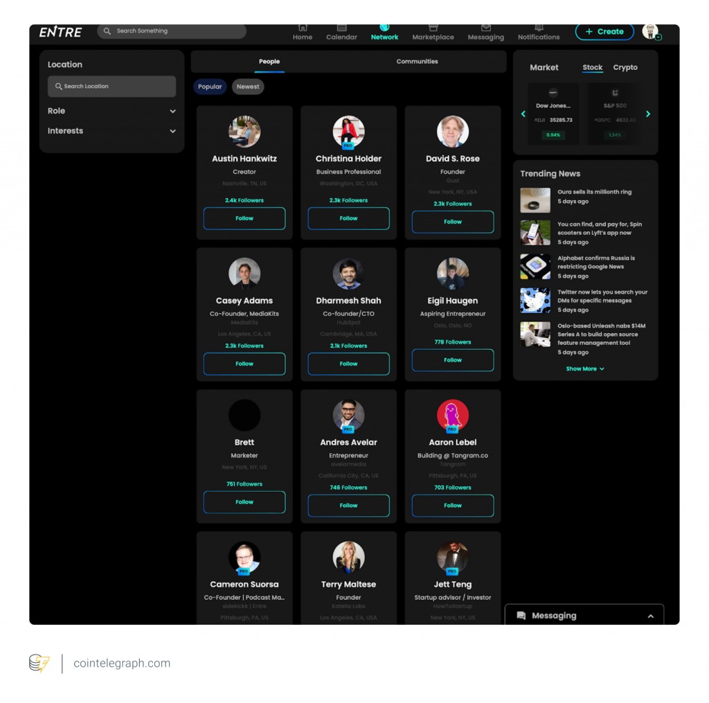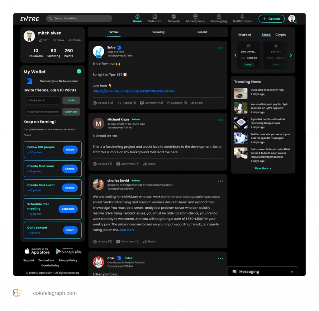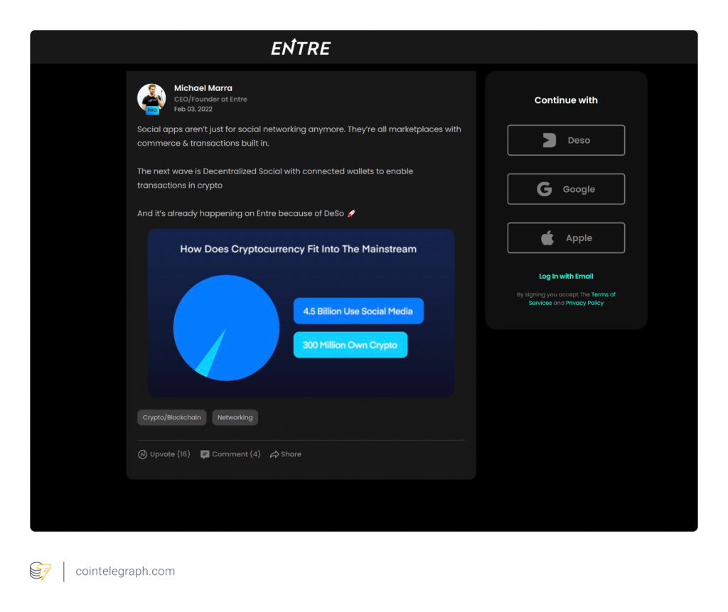 Entre, short for “entrepreneur,” is a social Web3 application that runs on DeSo. On Entre, the self-employed, the traditionally employed and any other professional can post Twitter-like content and carry out business transactions. They can conduct meetings, host virtual events and hire staff members, with the app functioning like a decentralized, digitally monetizable alternative to LinkedIn, Zoom and Google Calendar — all jammed together into a single product.