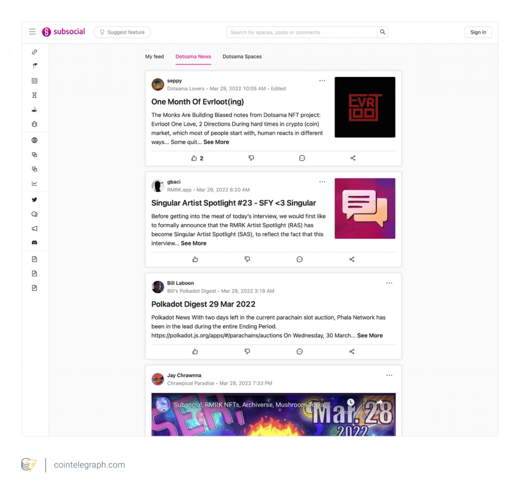 Subsocial doesn’t consider itself a decentralized social network, rather a platform for building social networks. It allows users to create profiles and customize personal “Spaces” and claims to have serverless public timelines, roles and permissions, user governance, moderation, Spaces for DAOs, and a treasury. The platform runs on the Polkadot and Kusama blockchains, and it recently built its first app, a decentralized Reddit–Medium hybrid.