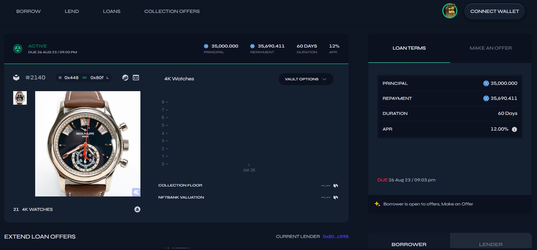 The NFT was then listed on the DeFi lending protocol Arcade. After listing the item, lenders pitched their offers to the borrower. The user then accepted the best loan offer they could find. Following this, the NFT was sent to an escrow wallet, where it would stay until the loan was paid in full or if the borrower defaulted. If the borrower fails to pay the loan, the NFT will be awarded to the lender. It can then be burned to claim the watch.
