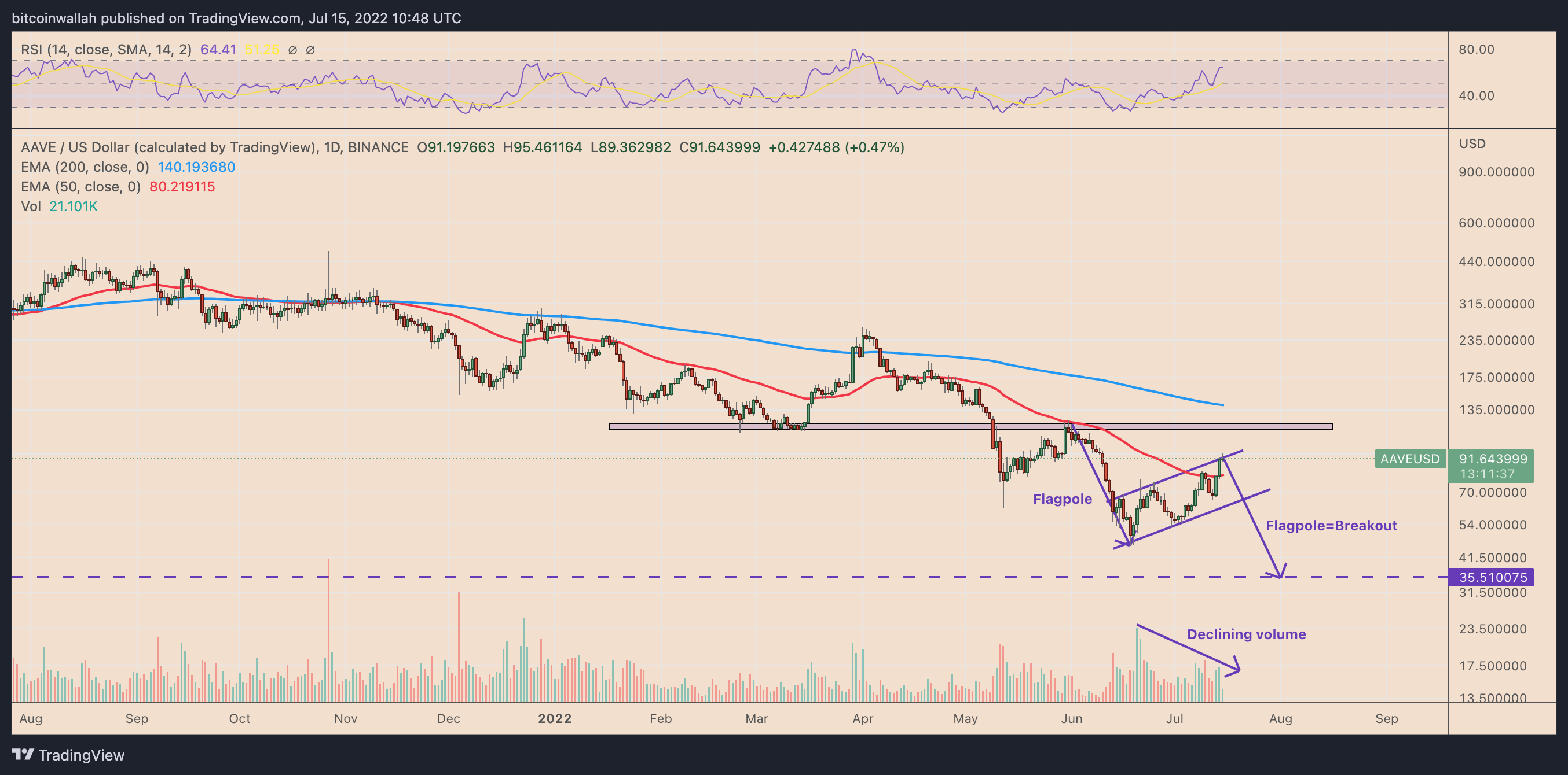 As a rule of technical analysis, the breakdown below $67.75 could see AAVE plunging by as much as the height of the “flagpole” that formed before the bear flag. That would have the token eye $35.50 as its bear flag profit target, down over 60% from the current price.