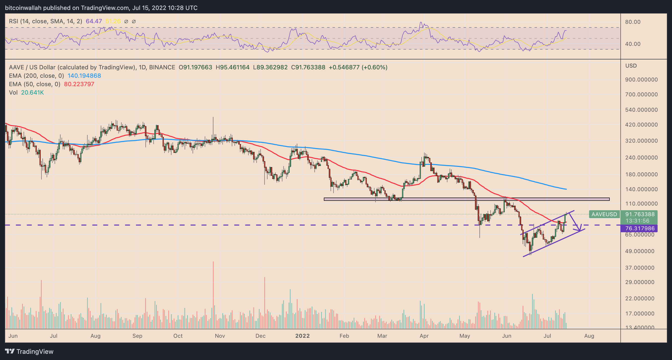 However, any further gains would risk pushing AAVE into “overbought” territory with its daily relative strength index (RSI) treading just five points below 70 as of July 15