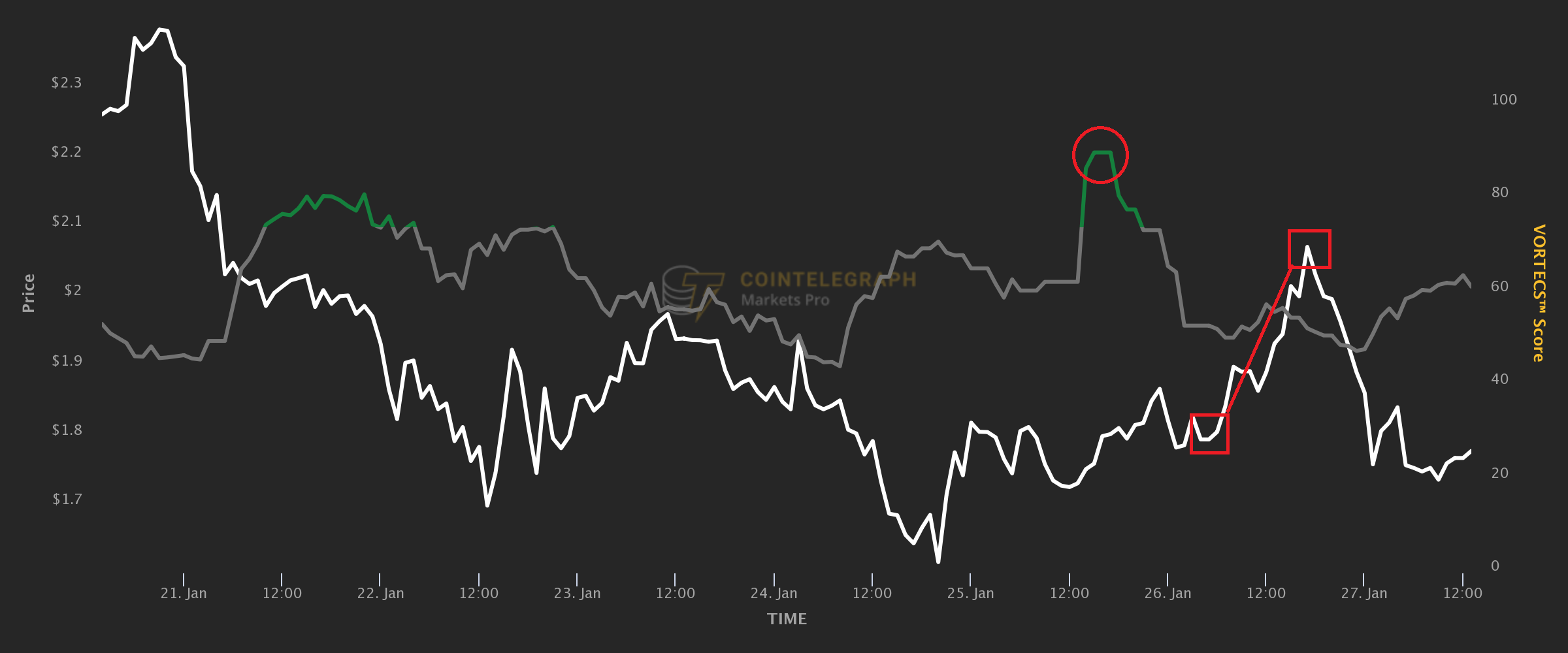 Throughout January 2022, a total of 18 crypto assets have achieved a VORTECS™ Score of 90. One of them was Voyager Token (VGX), pictured below, which hit the threshold on Jan. 25 against a price of $1.76 (red circle in the chart). Before the asset’s score went below 70, the price rose to $1.87. In the following hours, it went further up to $2.07, but that additional gain would not be accounted for in the 90/70 results.