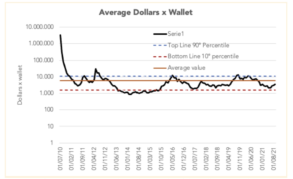 As can be seen from the graph, the average amount (United States dollars) in wallets fluctuates due to supply and demand (many wallets hold Bitcoin without ever moving it), so if we take the 90th percentile and the 10th percentile, we can find a range that can lead us to subsequently estimate the price of Bitcoin.