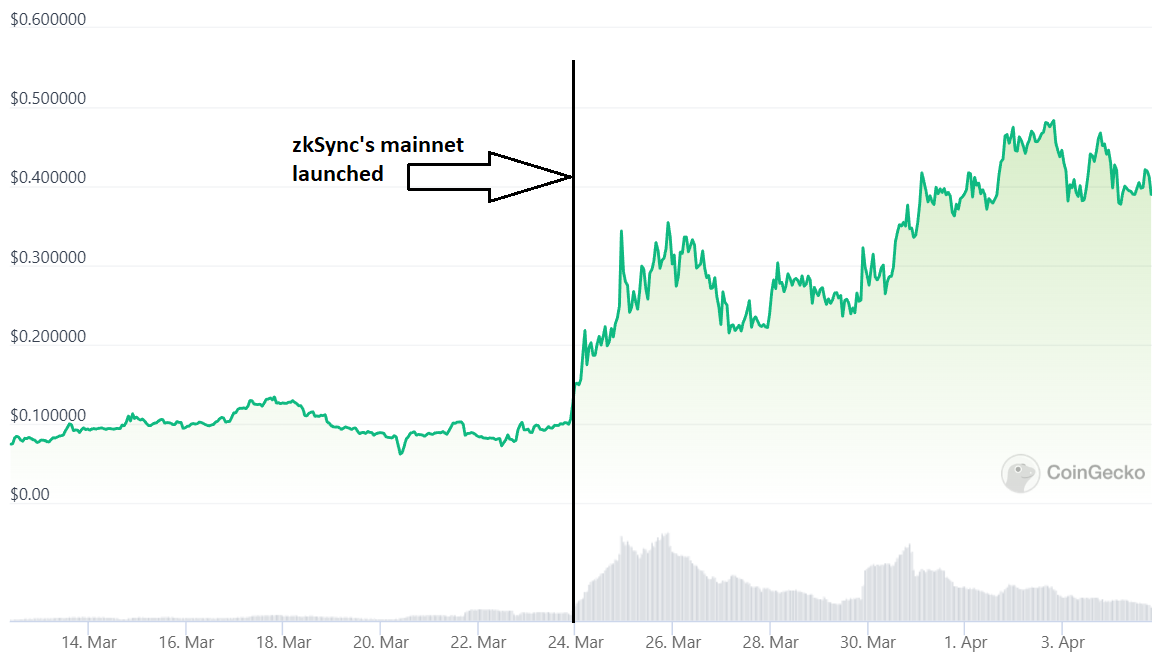 Similarly, SpaceFi’s token price has increased by over 300% since the launch of the zkSync Era mainnet from $0.10 to $0.41.