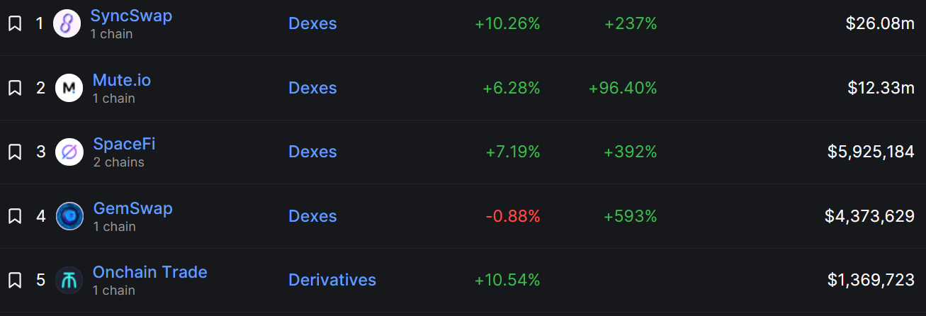 SyncSwap is the top decentralized exchange with $25 million total liquidity locked (TVL), representing 50% of the total value in DeFi protocols. The next three largest DeFi protocols on there are also decentralized exchanges, including Mute with a TVL of $12.4 million, SpaceFi with $5.8 million and GemSwap with $4.4 million.