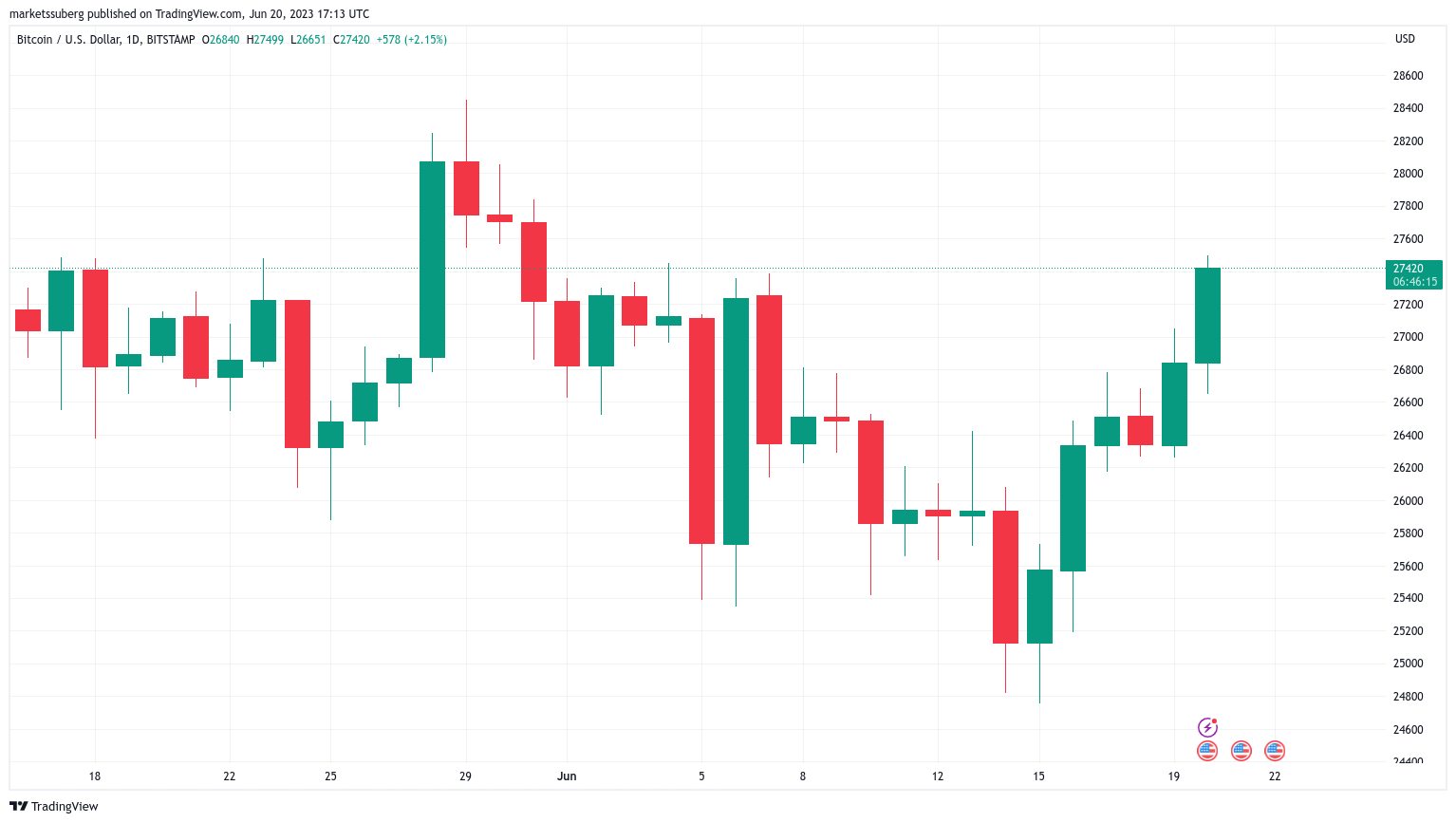 Data from Cointelegraph Markets Pro and TradingView showed BTC/USD reaching $27,499 on Bitstamp.