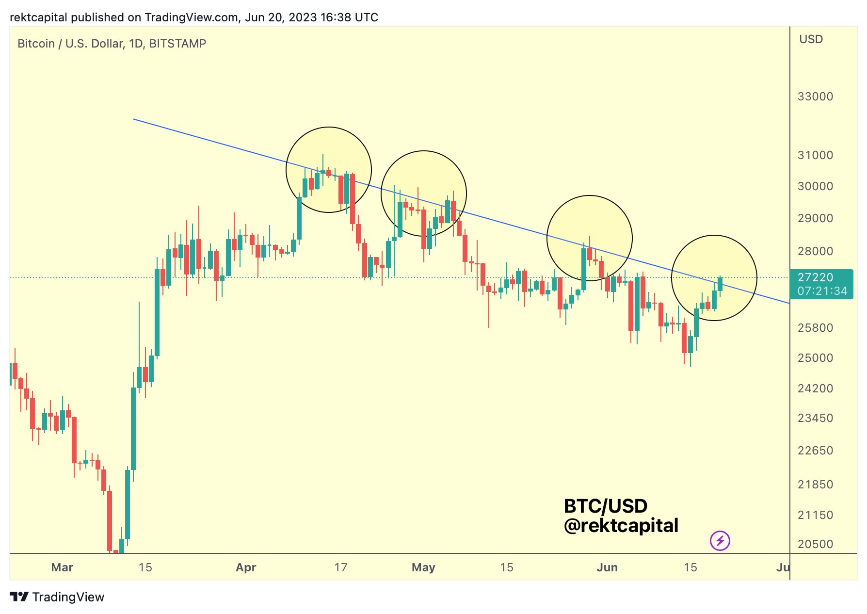 “It’s difficult to look for Daily breakout confirmation for BTC in the context of this blue Lower High diagonal resistance,” trader and analyst Rekt Capital commented alongside an explanatory chart.