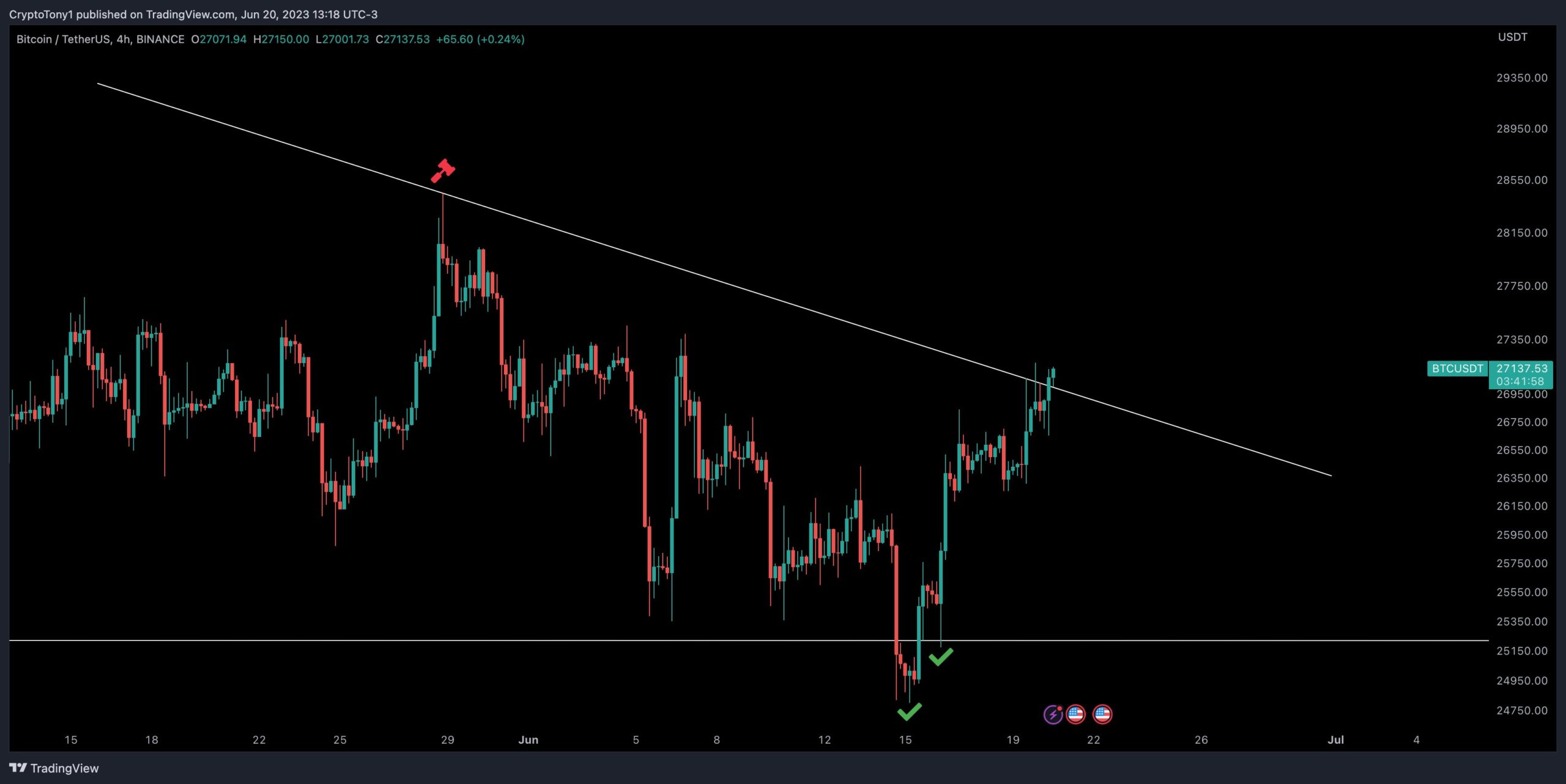 “Remember that $27,100 is a key level for the bulls to flip into support tonight.”