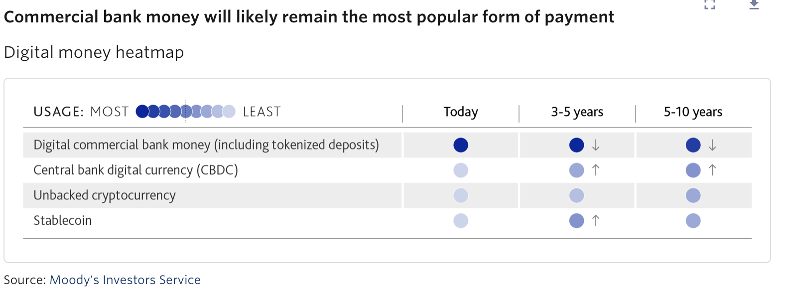 The monetary landscape is becoming fragmented, Moody’s said, but many new payment solutions support the use of commercial bank money. For example, “We believe that digital wallets […] will support the dominance of commercial bank money as long as bank accounts remain their primary source of digital currencies.”