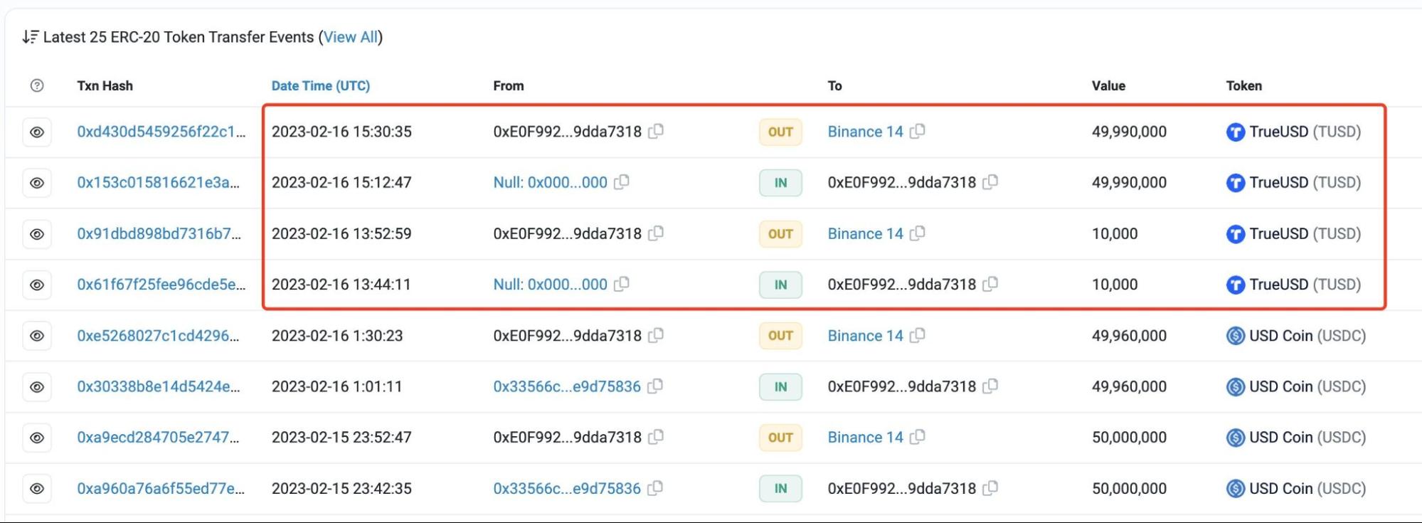 Following the regulatory action against BUSD, Binance turned to several alternative stablecoins, including a few decentralized ones, to fulfill its stablecoin-centered liquidity needs. From Feb. 16–24, Binance minted 180 million TrueUSD (TUSD) stablecoins.