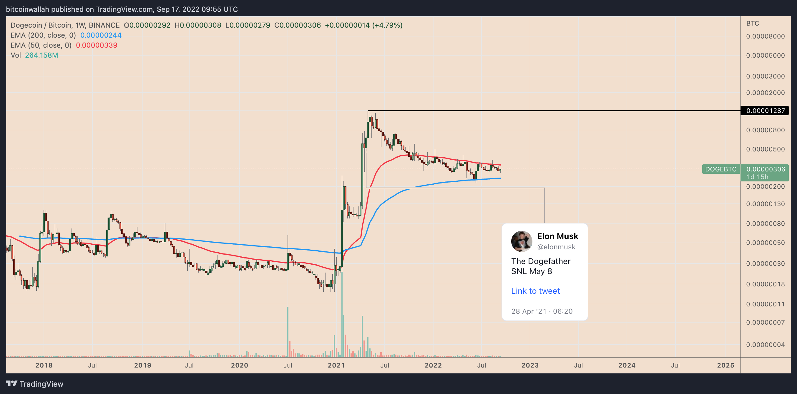 The DOGE/BTC trading pair has fallen 75% after peaking out at 1,287 satoshis on May 9, 2021, a day after Musk was a guest host on Saturday Night Live, including a sketch titled “The Dogefather.”