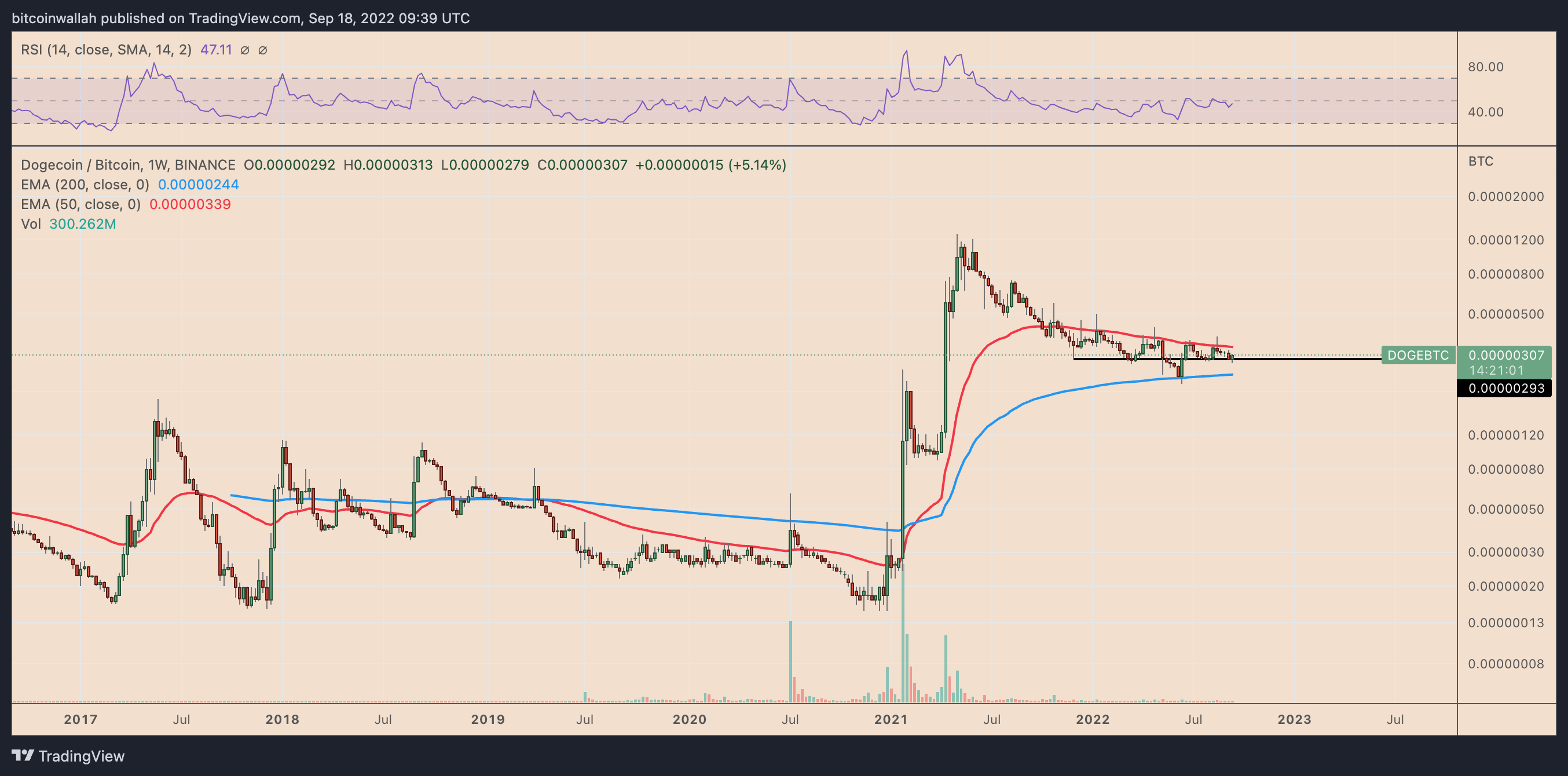 The technical setups also suggest the same. For instance, on the weekly chart, DOGE/BTC now tests 307 satoshis as its interim support, given the level’s history as a strong price floor since November 2021.