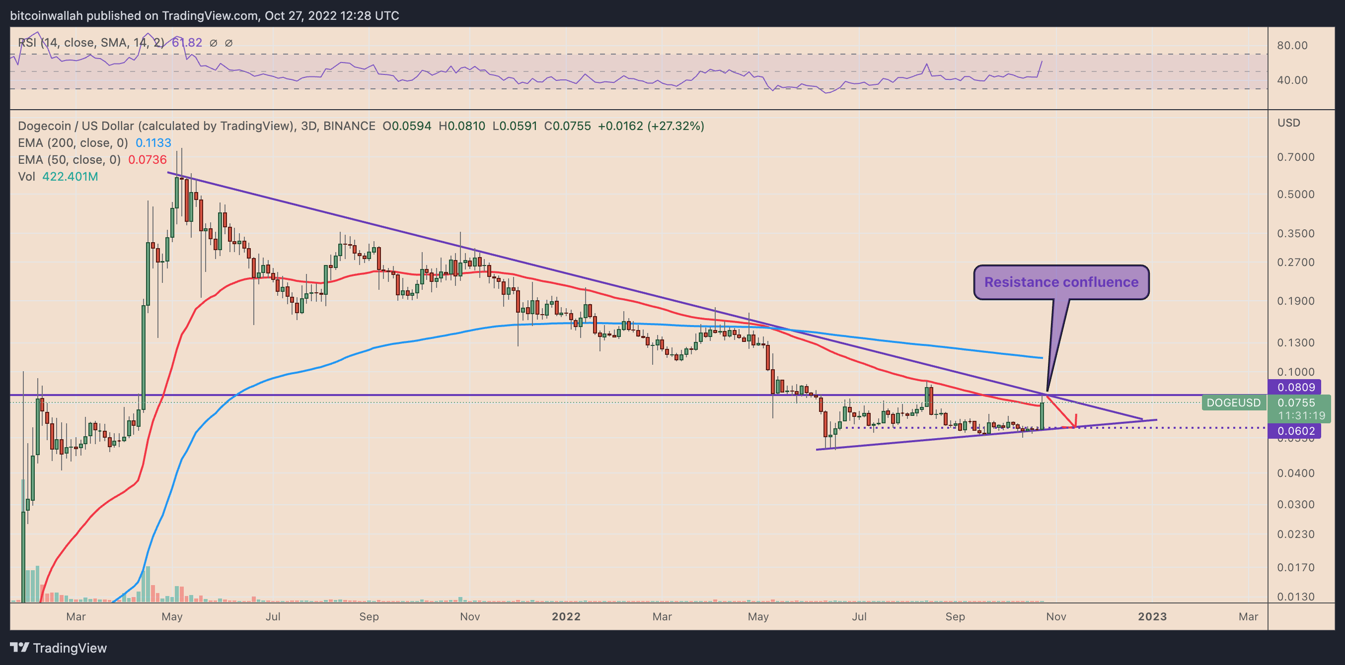 On the three-day chart, the confluence comprises three resistance levels: a multi-month descending trendline, the 50-3D exponential moving average (the red wave), and a horizontal level around $0.08, as shown below.