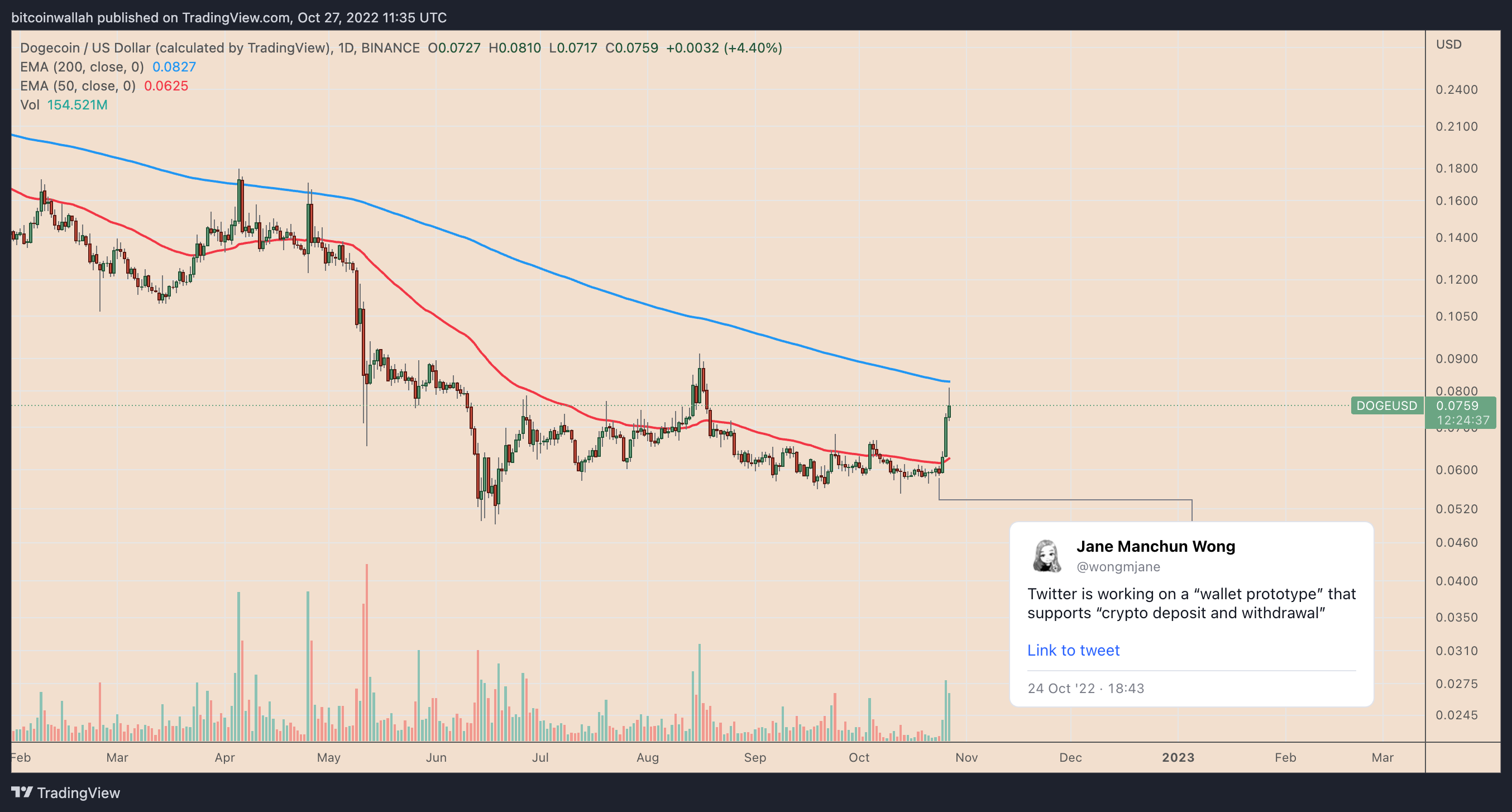 https://images.cointelegraph.com/images/840_aHR0cHM6Ly9zMy5jb2ludGVsZWdyYXBoLmNvbS91cGxvYWRzLzIwMjItMTAvNmFlZTI1NjQtMDQ0Yi00OGQwLThlZjQtZWUwODM3MWZiMTczLmpwZw==.jpgDogecoin’s (DOGE) price rallied to its best levels in two months as traders assessed Twitter’s potential to create a cryptocurrency wallet product.