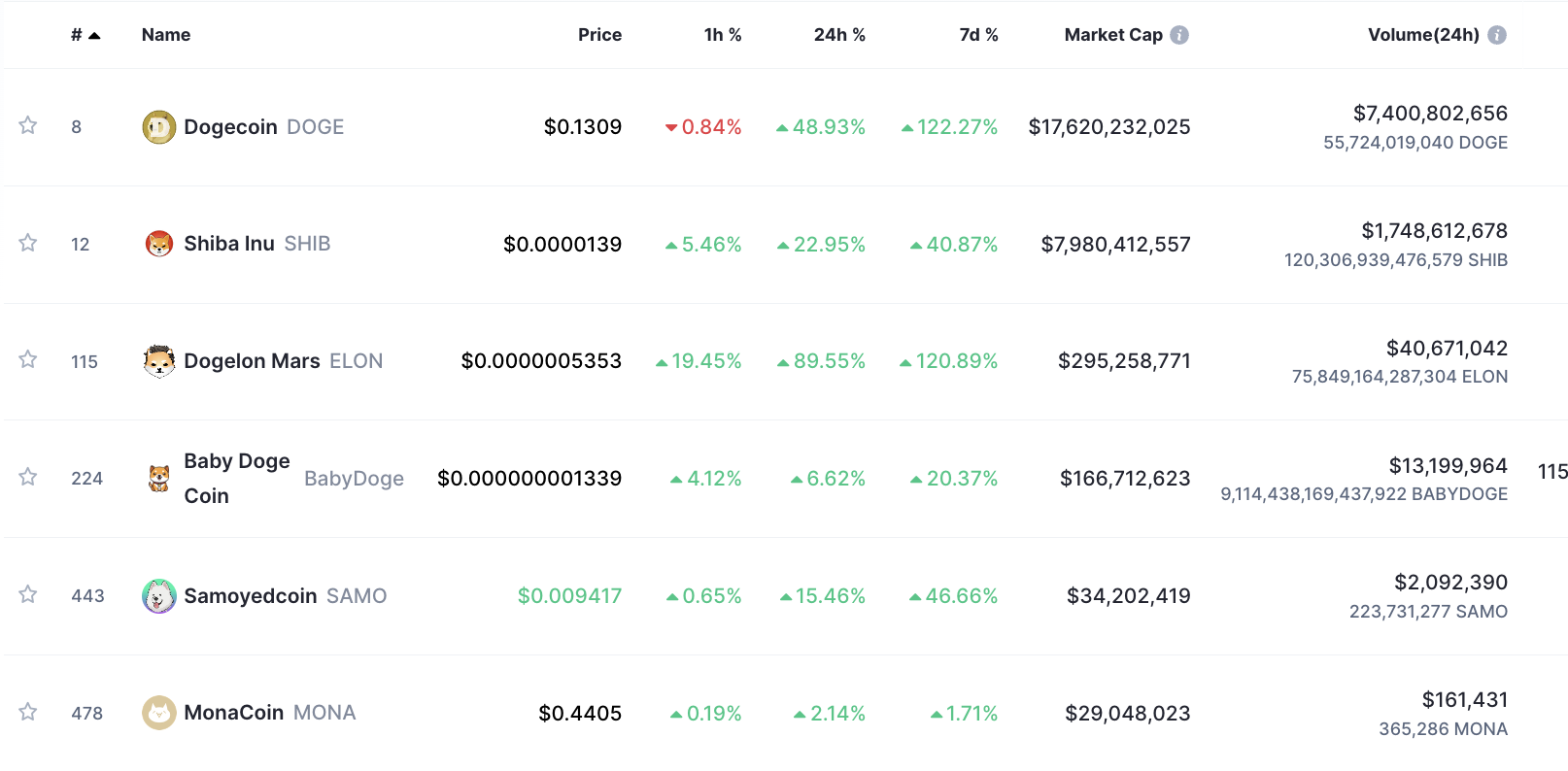 Additionally, other meme coins have jumped massively in the said period, including Dogelon Mars (ELON), which rallied 140%.