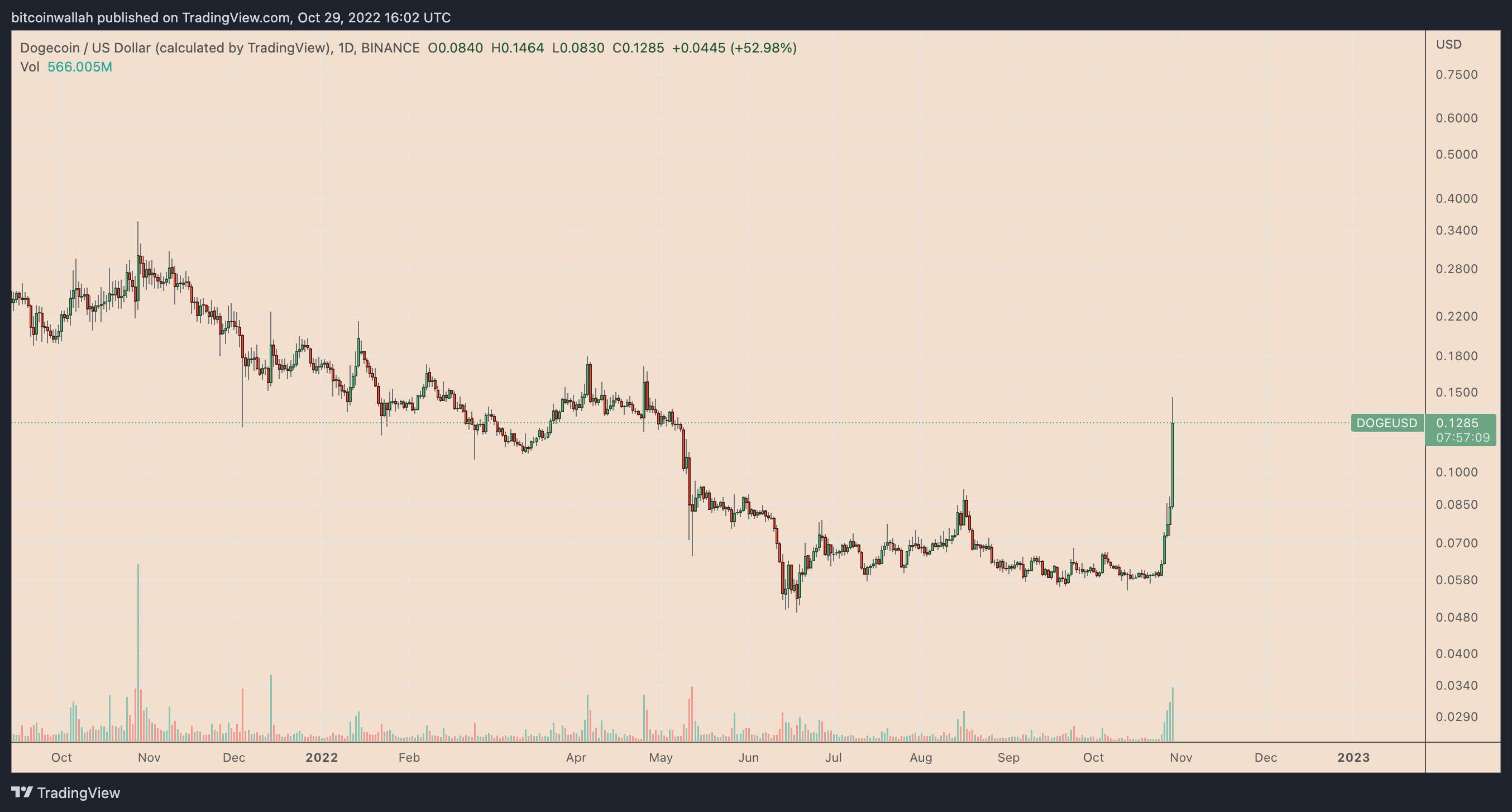 https://images.cointelegraph.com/images/840_aHR0cHM6Ly9zMy5jb2ludGVsZWdyYXBoLmNvbS91cGxvYWRzLzIwMjItMTAvMzM4Y2E2NmUtNDg2Mi00YTk0LTk0ODQtMjEyZjI3NjNhY2U4LmpwZw==.jpgThe Dogecoin (DOGE) price rally extended further on Oct. 29 in hopes that the cryptocurrency would get a major boost from Elon Musk’s Twitter acquisition.