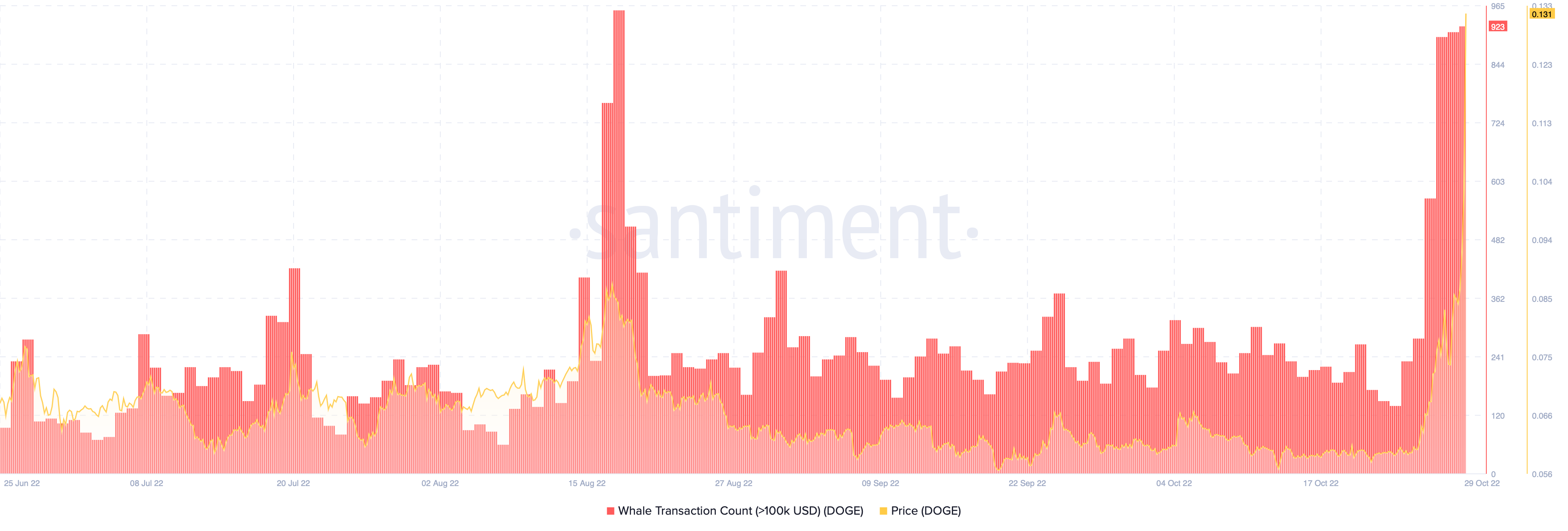 The surge was also accompanied by a decent increase in its daily trading volumes. That coincided with a spike in the number of DOGE transactions exceeding $100,000, according to Santiment. Both indicators sugges a growing demand for Dogecoin tokens among rich investors, or so-called “whales.”