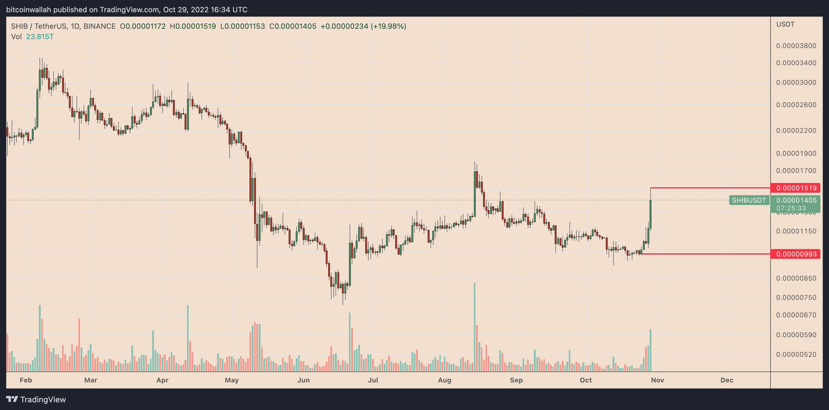 On Oct. 29 alone, SHIB’s price jumped by 30% to $0.00001519, its highest level since August 2022. Like Dogecoin, Shiba Inu’s rally came as a part of a broader uptrend that started on Oct. 25. Since then, its price has gained 53%.