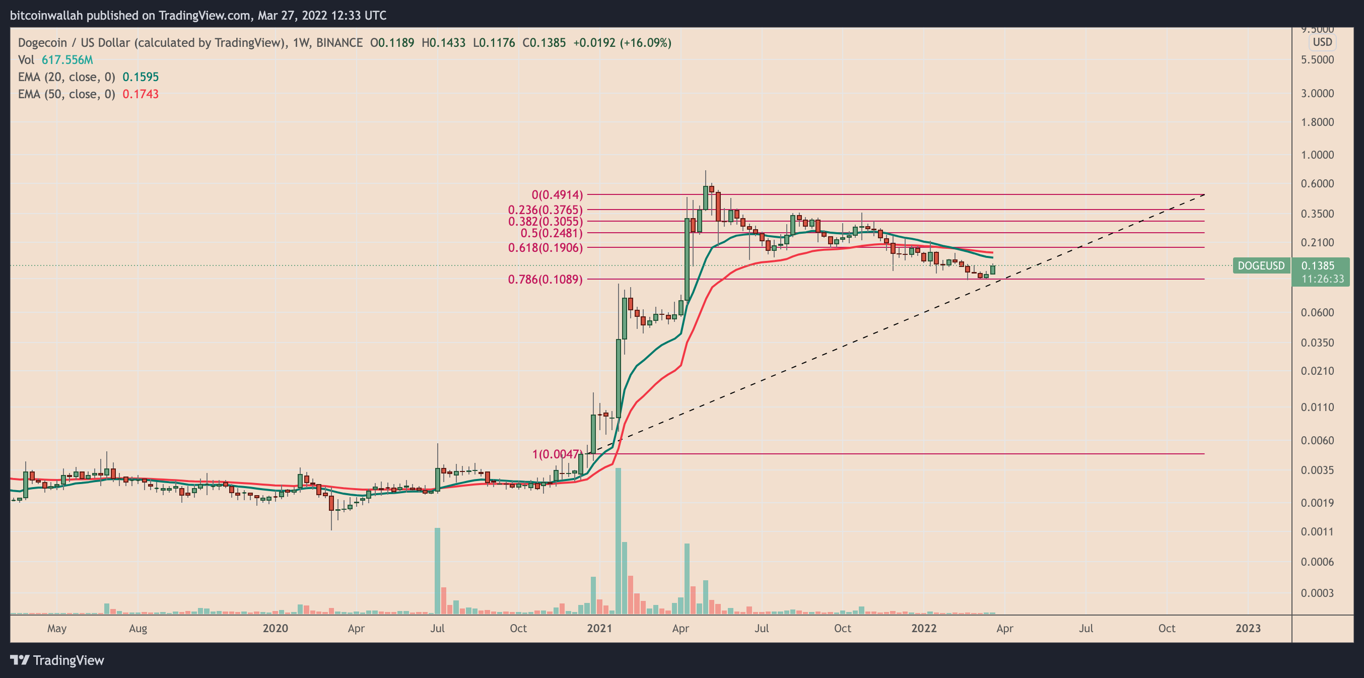Dogecoin’s latest rebound move now eyes a quick run-up towards the $0.15-0.19 area, a range encapsulating three psychological resistance levels: the 20-day exponential moving average (20-day EMA; the green wave), the 50-day EMA (the red wave), and the 0.618 Fib line (near $0.19) of the Fibonacci retracement graph — all shown in the chart below.