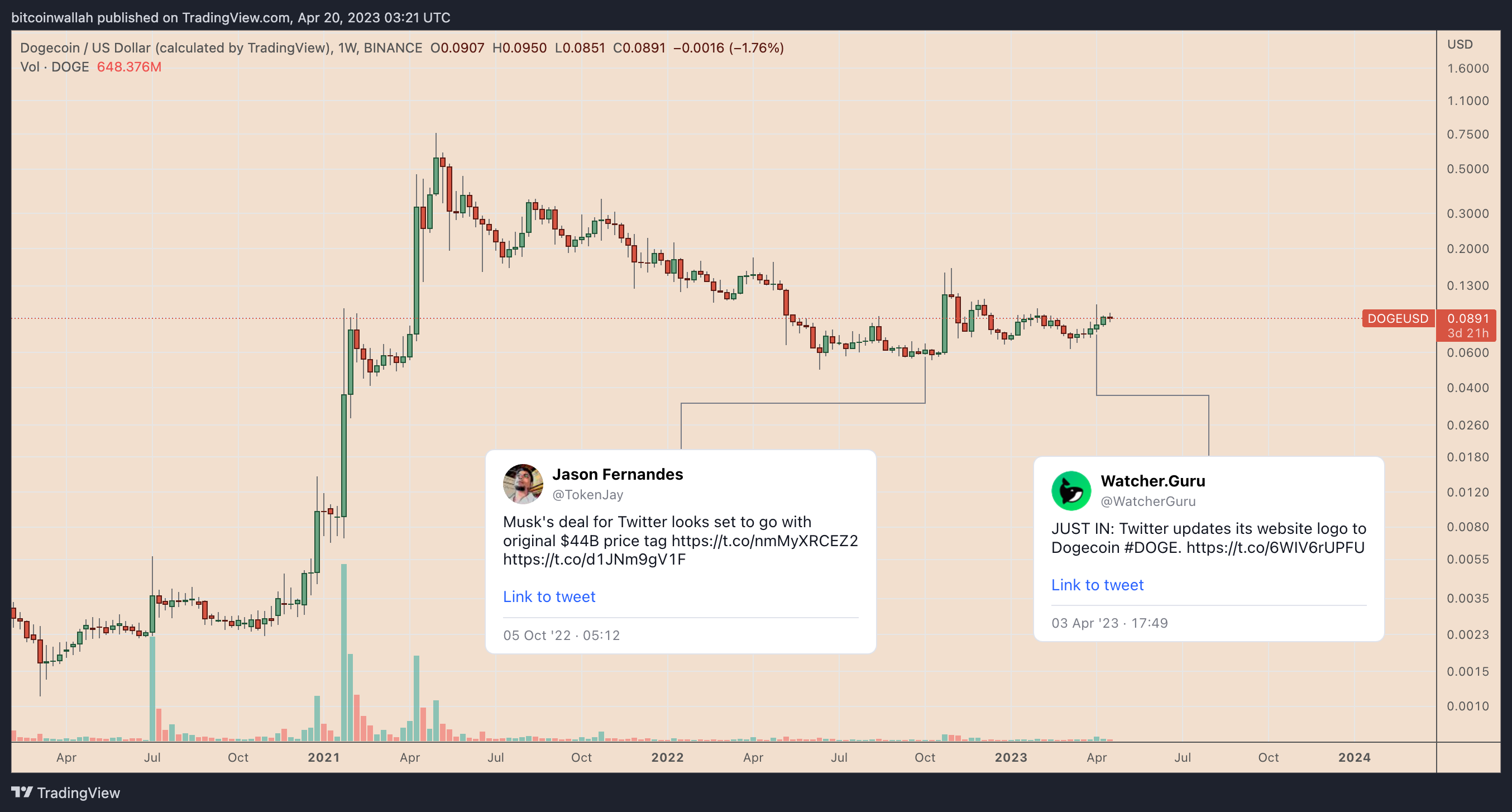 As of April 2023, Musk has not added a DOGE payment option on Twitter. Though, he briefly replaced the platform’s iconic bluebird logo with Dogecoin’s official mascot, the Shiba Inu meme, earlier in the month. DOGE rallied by up to 40% on the news.