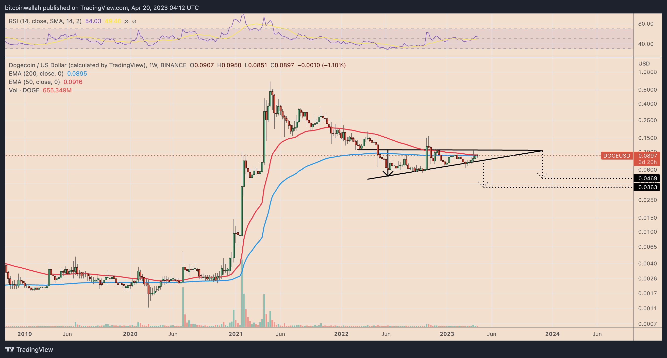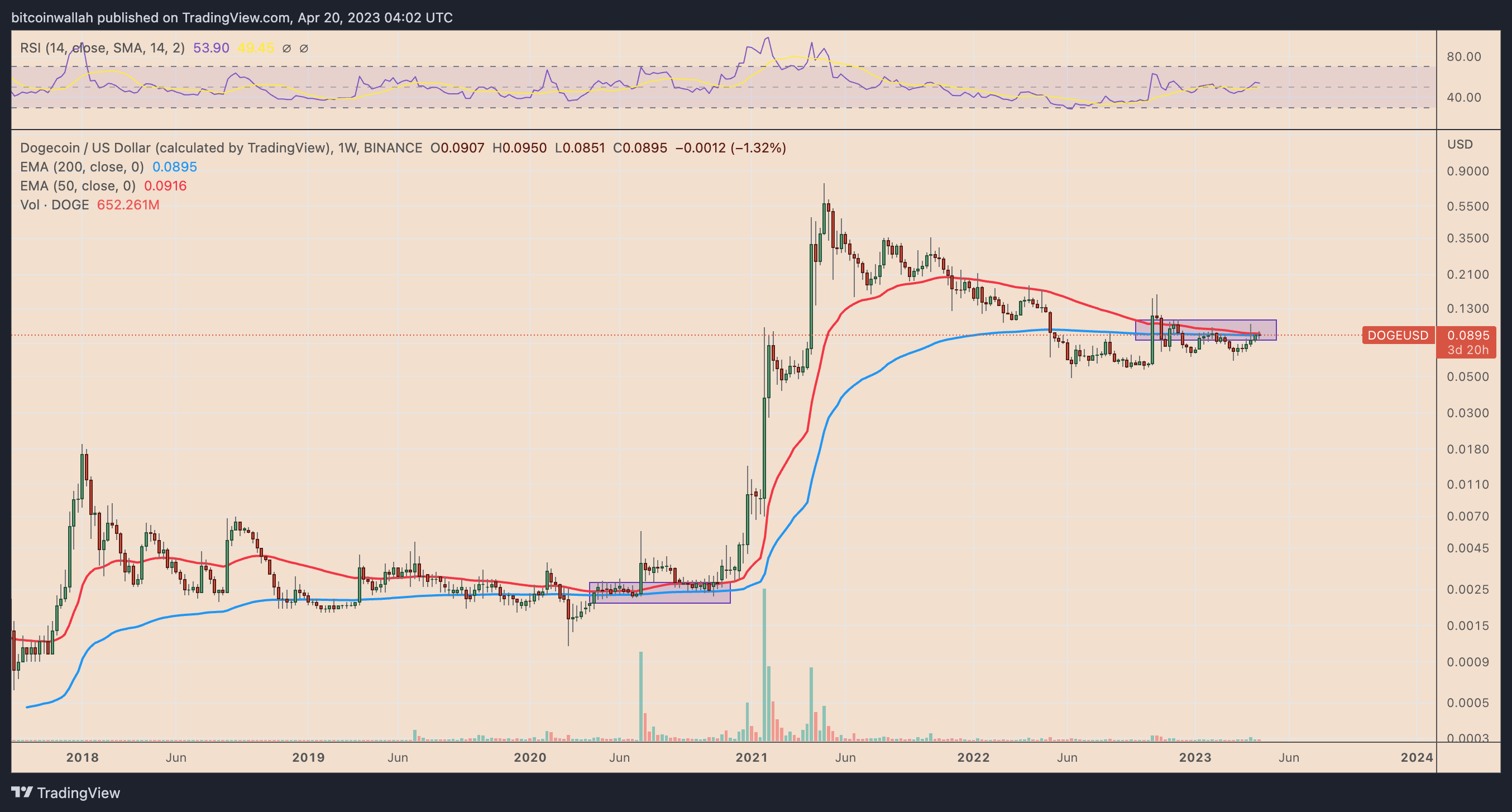 Notably, DOGE price has attempted to close above its 50-week (the red wave) near $0.0917 and 200-week EMA (the blue wave) near $0.0895. That is similar to its sideways action and breakout attempts in April-November 2020 that preceded a 30,000% price rally.