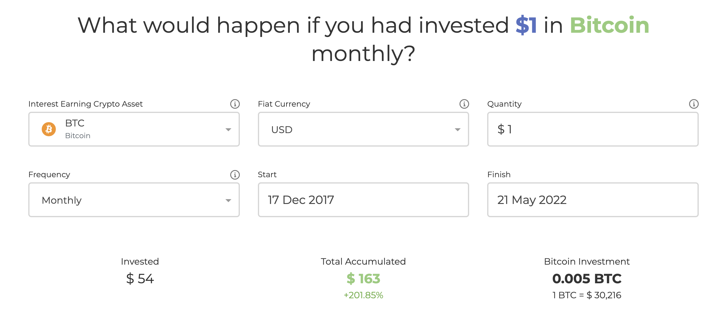 For instance, a dollar invested into Bitcoin every month after it topped out in December 2017—near $20,000—has given investors a cumulative return of $163, according to CryptoHead’s DCA calculator. That means a circa 200% profit from consistent investments.