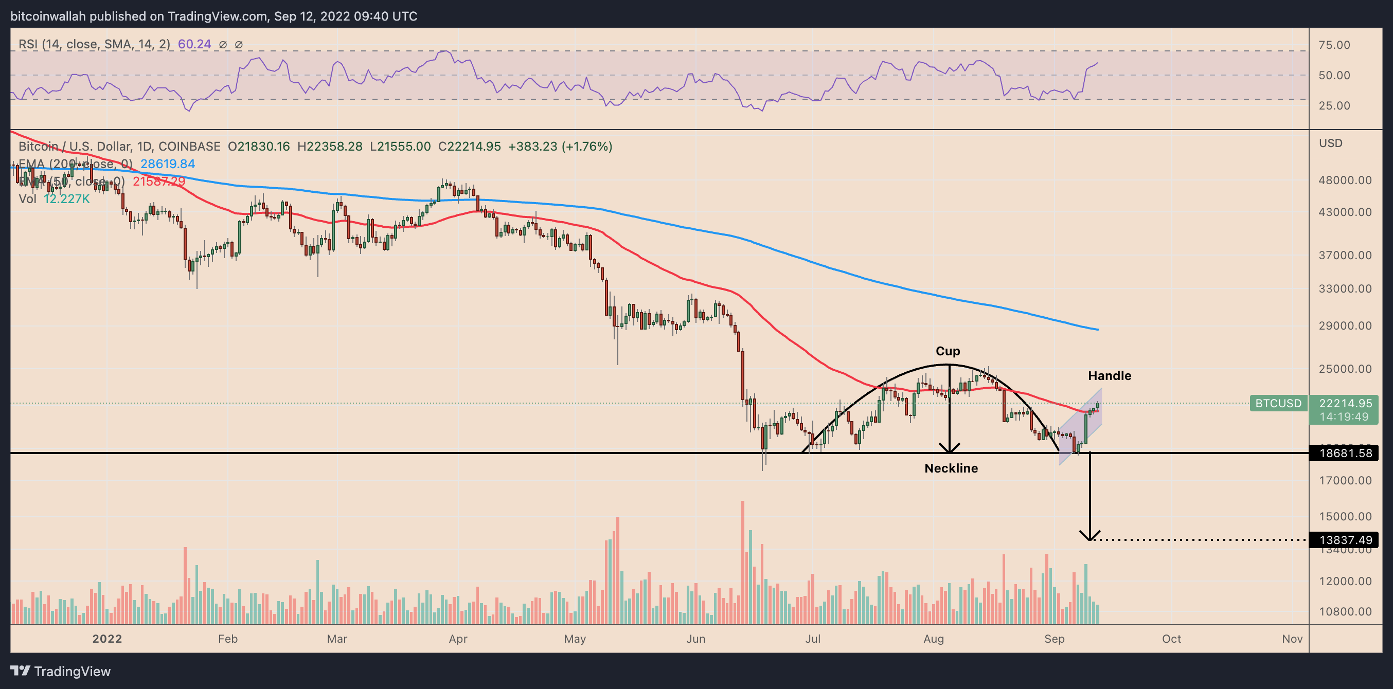 Bitcoin appears to have been forming an inverse-cup-and-handle bearish reversal pattern, confirmed by a flipped U-shaped price trend (cup) followed by a short uptrend (handle), all atop a common support level called the “neckline.”