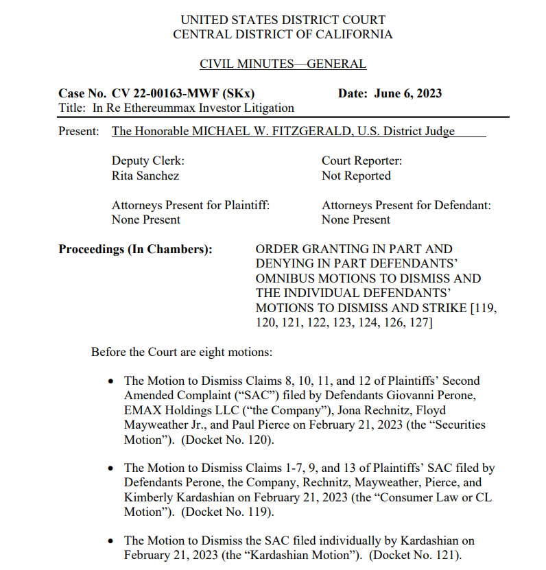 However, in a new ruling on June 6, U.S. District Judge Michael Fitzgerald refused to throw out the plaintiff’s “unfair competition” claims against reality TV star Kardashian and boxing champion Mayweather for their role in promoting the EMAX token in 2021.