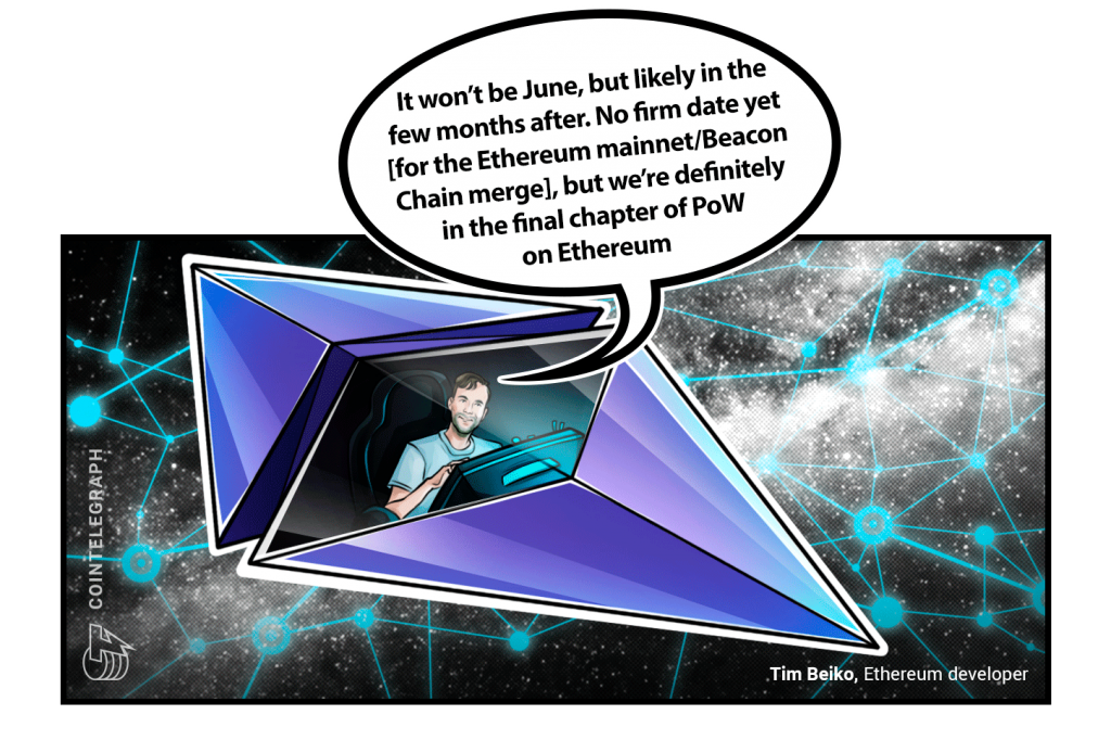 “It won’t be June, but likely in the few months after. No firm date yet [for the Ethereum mainnet/Beacon Chain merge], but we’re definitely in the final chapter of PoW on Ethereum.”