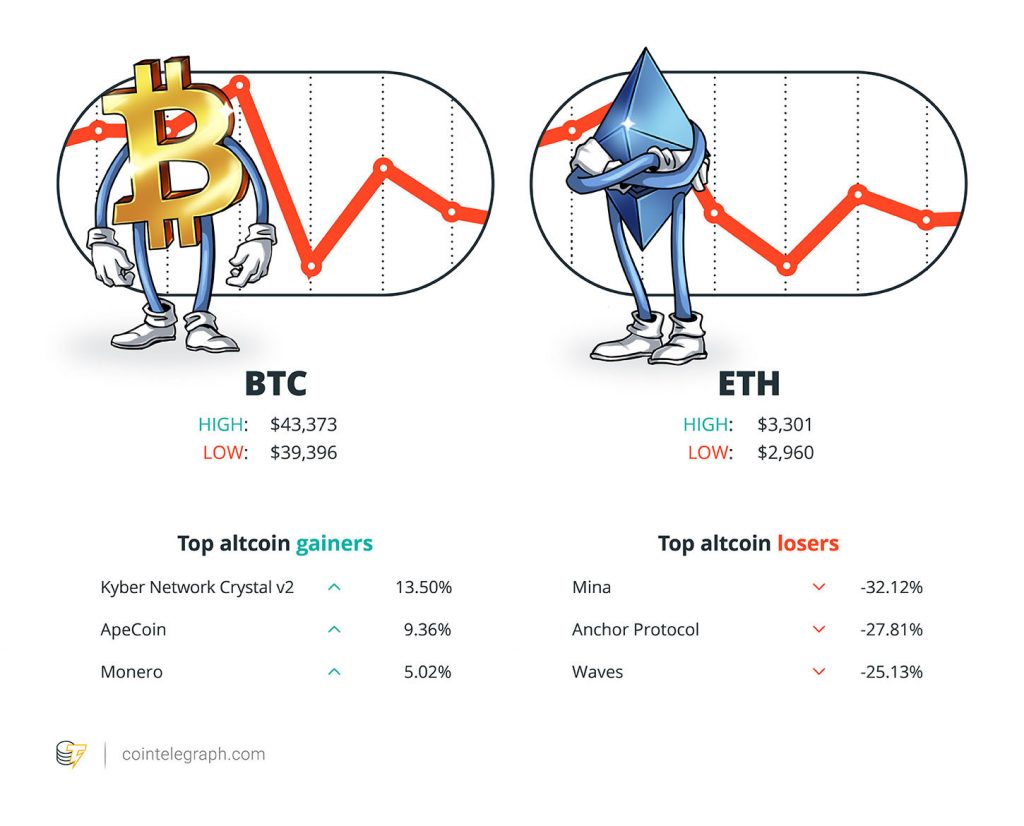 This week, Bitcoin’s price traded downward and somewhat sideways for the most part, breaching below the $40,000 mark on multiple occasions, according to Cointelegraph’s BTC price index. BTC traded above $43,000 and below $39,500 inside the week.