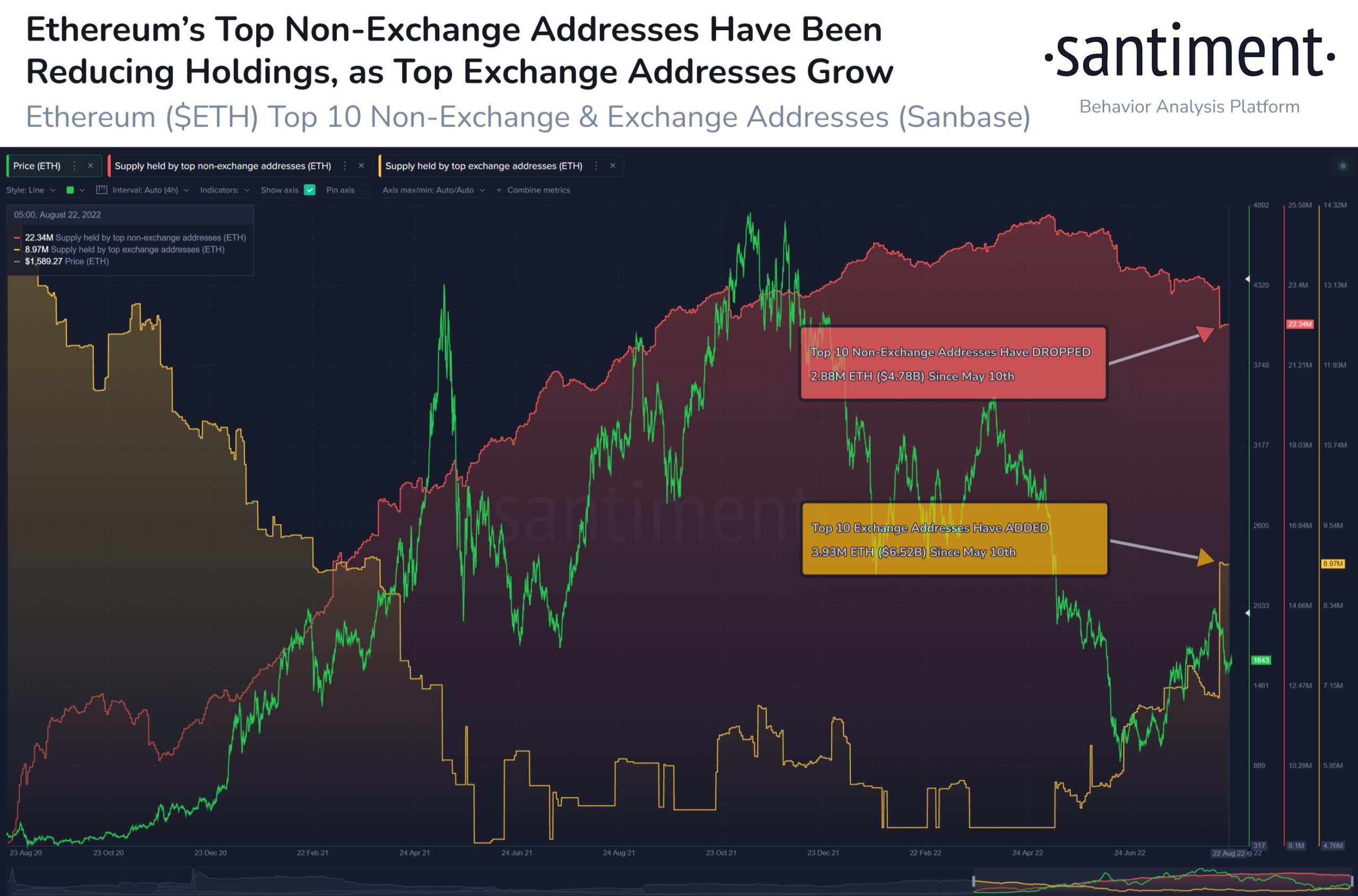 Data from crypto analytic firm Santiment indicates that the gap between Ethereum’s top-10 largest non-exchange addresses and exchange addresses is closing. Over the past three months, top whale addresses have sent a significant amount of ETH onto exchanges as non-exchange addresses saw a decline of 11% while exchange-based addresses have seen a 78% surge.