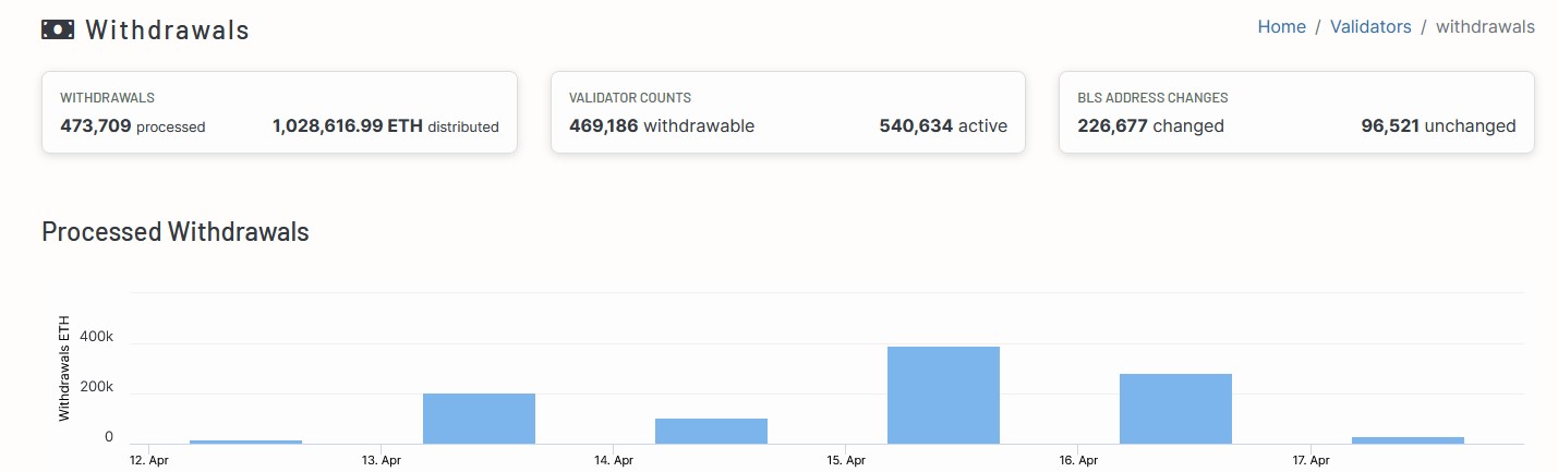 The 1.03 million ETH withdrawals have come from 473,7000 withdrawal requests, with Saturday, April 15 being the largest withdrawal day at 392,800 ETH according to data from beaconcha.in.
