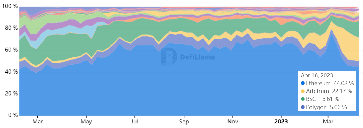 Ethereum market share by volume on decentralized exchanges (DEX) peaked at 75% in the week ending March 5 but has steadily declined to 44% in the week ending April 16.
