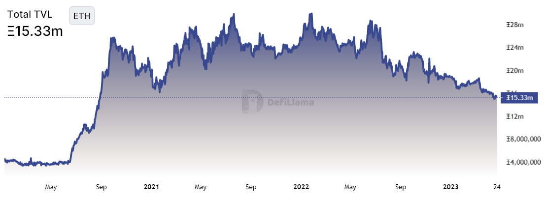 According to DefiLlama data, Ethereum Dapps reached 15.3 million ETH in total value locked (TVL) on April 24. That compares with 22.0 million ETH six months prior, a 30% decline. As a comparison, TVL on BNB Smart Chain in BNB terms declined by 20%, and Polygon network’s MATIC deposits decreased by 11%.