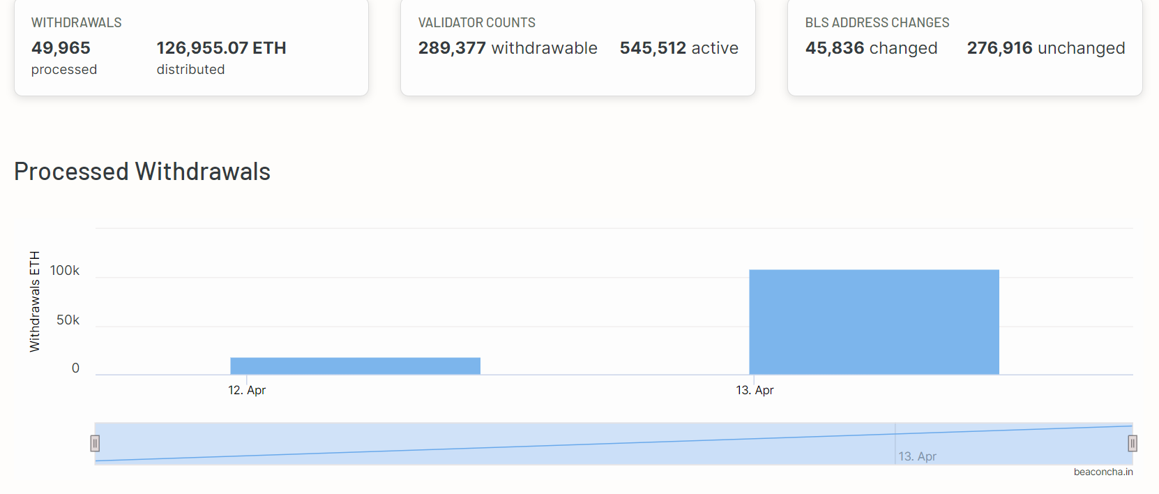 Kraken on the other hand started withdrawing validators for their United States customers on April 11 and began processing withdrawals of ETH after the completion of the Shapella upgrade. The early withdrawal of validators by the exchange is caused by the U.S. Securities and Exchange Commission action brought against Kraken’s Ethereum staking product back in February.