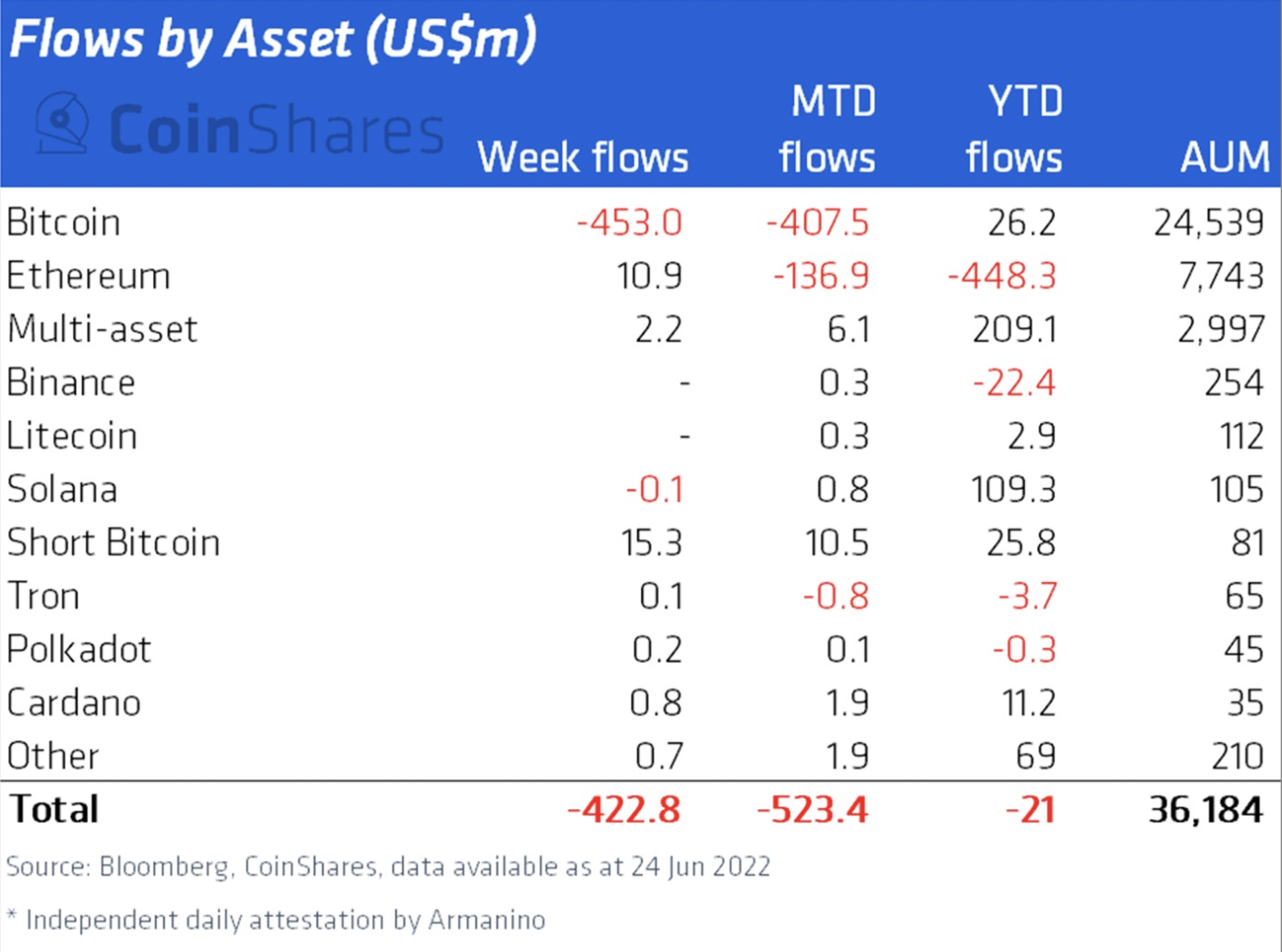 Ether-focused investment products have witnessed $136.9 million worth of outflows in June. In 2022 so far, they have processed circa $450 million in withdrawals, confirming that traditional investors are very bearish on ETH.
