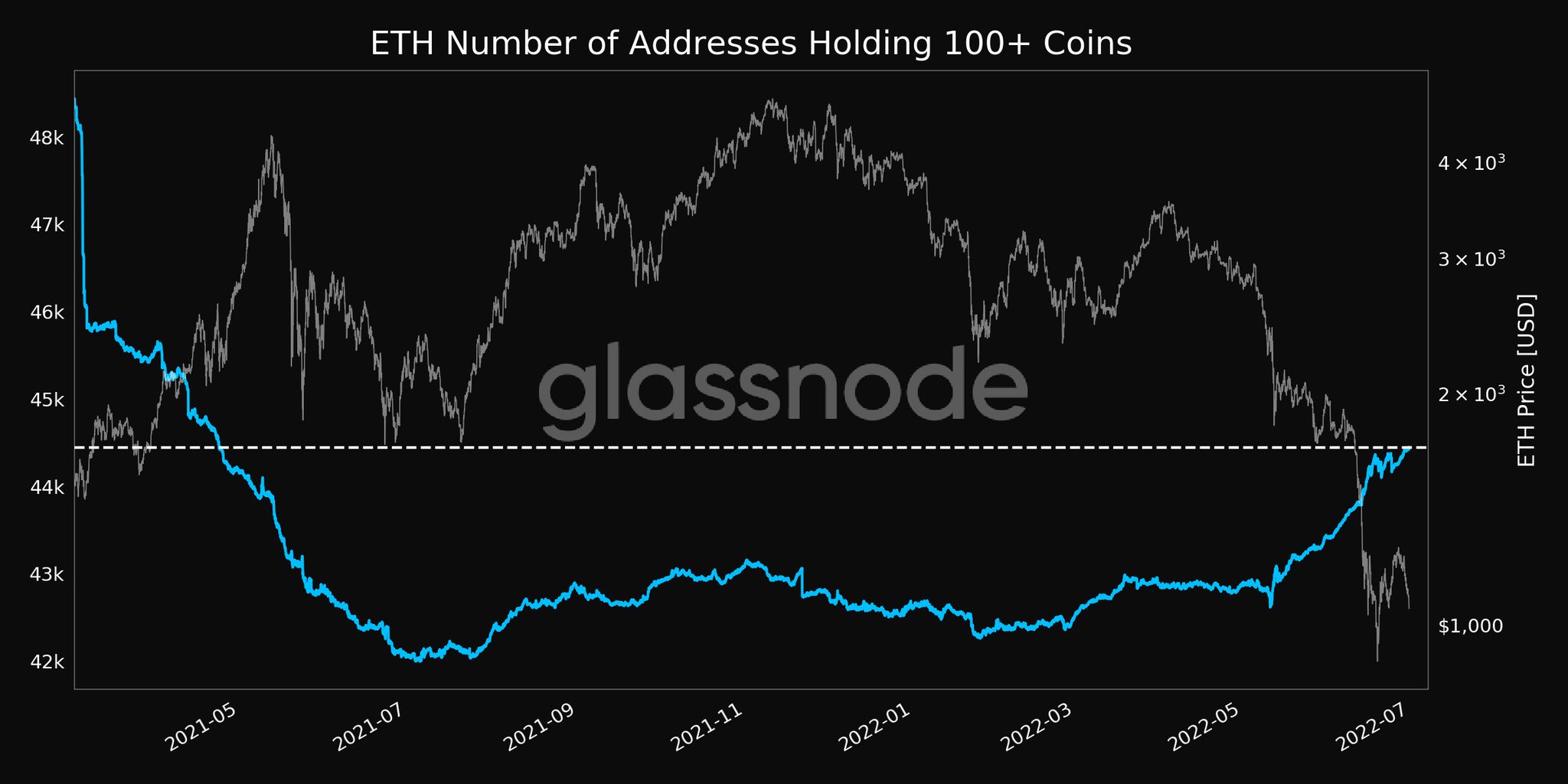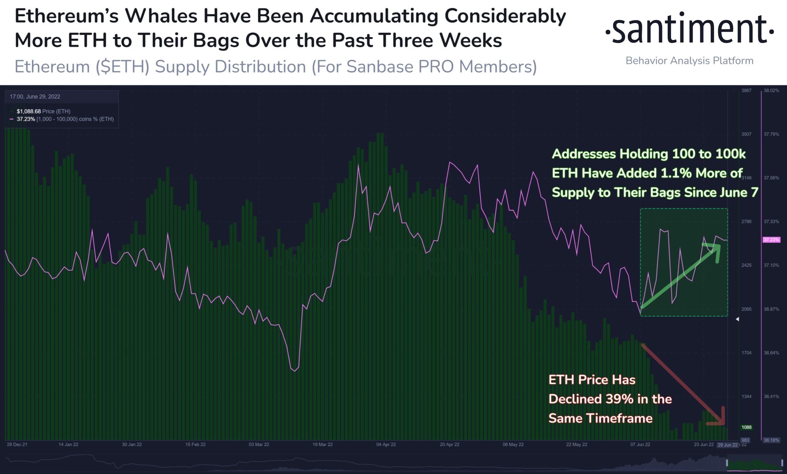 “Ethereum shark and whale addresses (holding between 100 to 100K $ETH) have collectively added 1.1% more of the coin’s supply to their bags on this -39% dip [since June 7],” noted Santiment, a crypto-focused data analytics platform, adding: