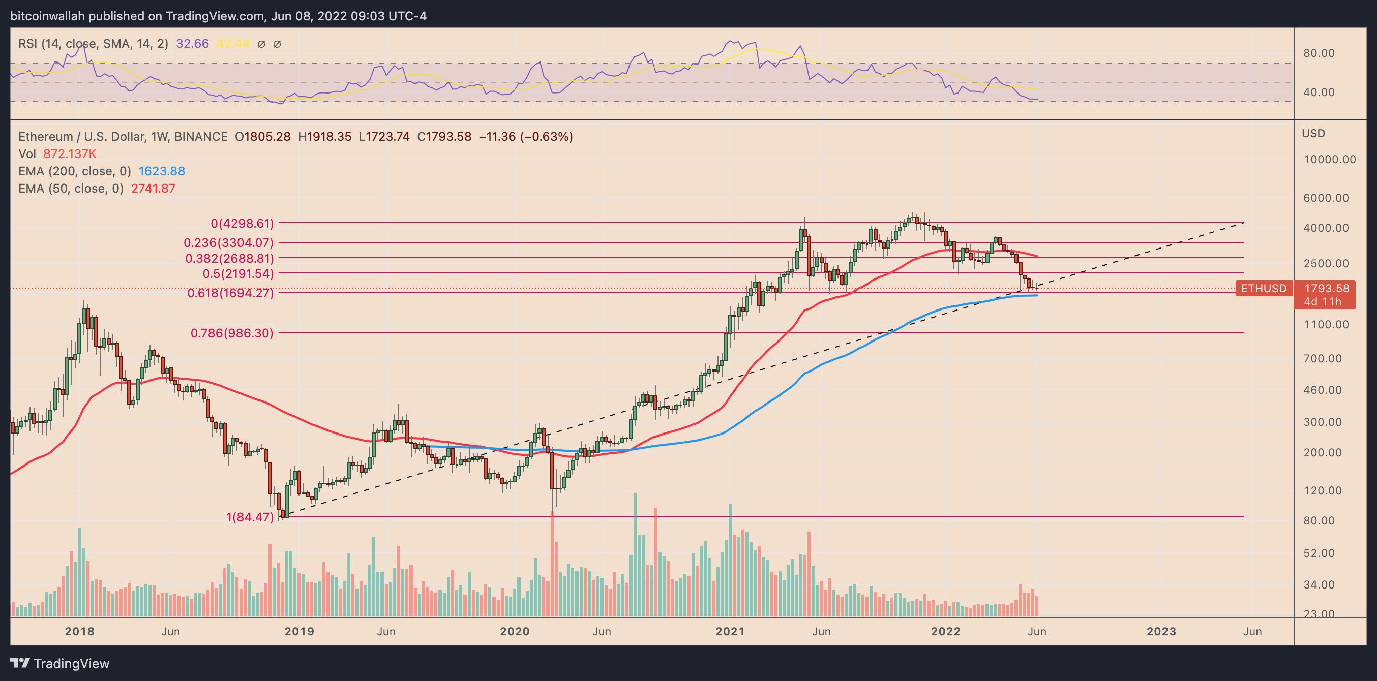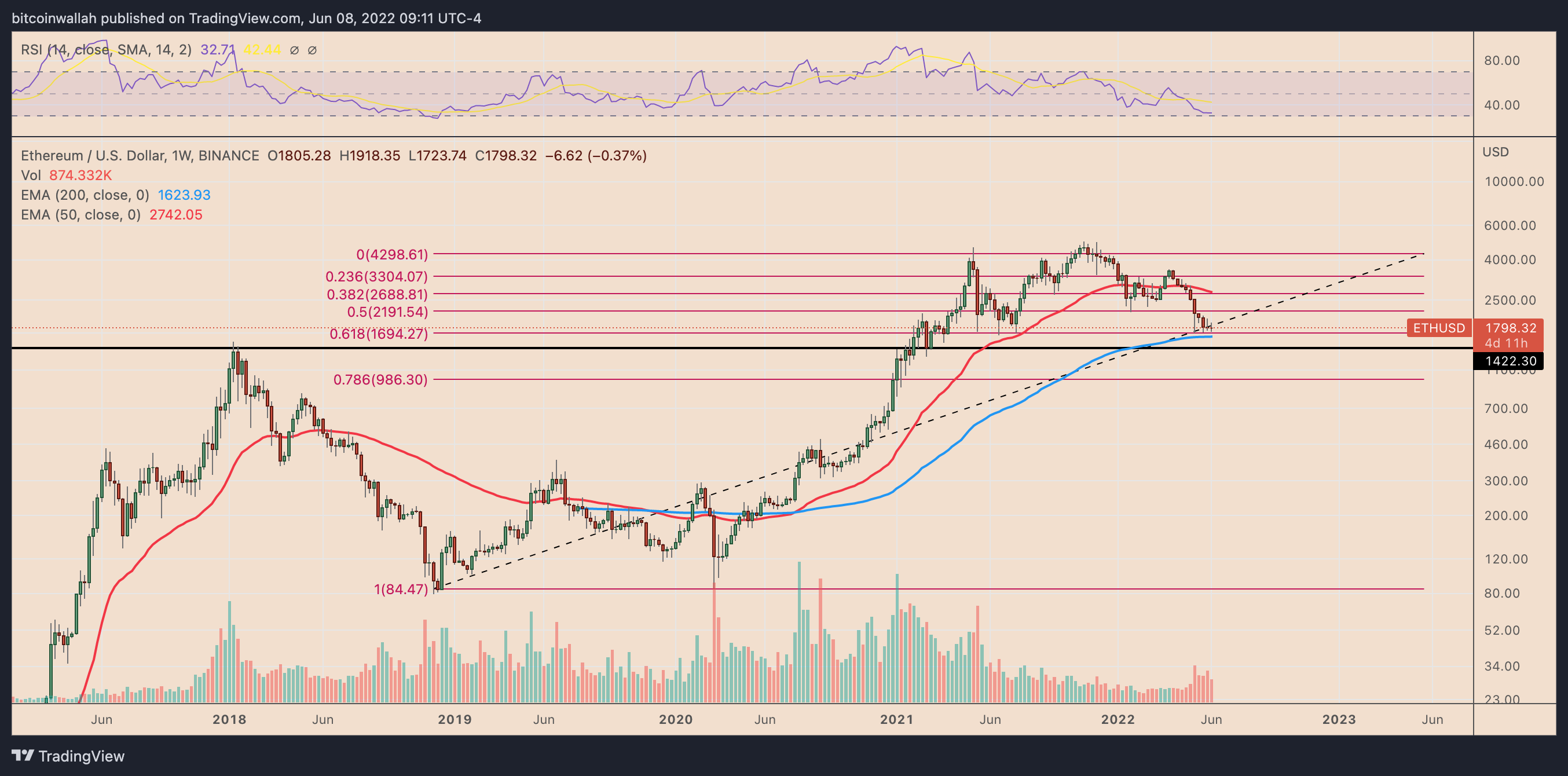 If ETH price rebounds as described above, then the next bullish target is the 0.5 Fib line (near 2,120) of the Fibonacci retracement graph, drawn from the $85-swing low to the $4,300-swing high.