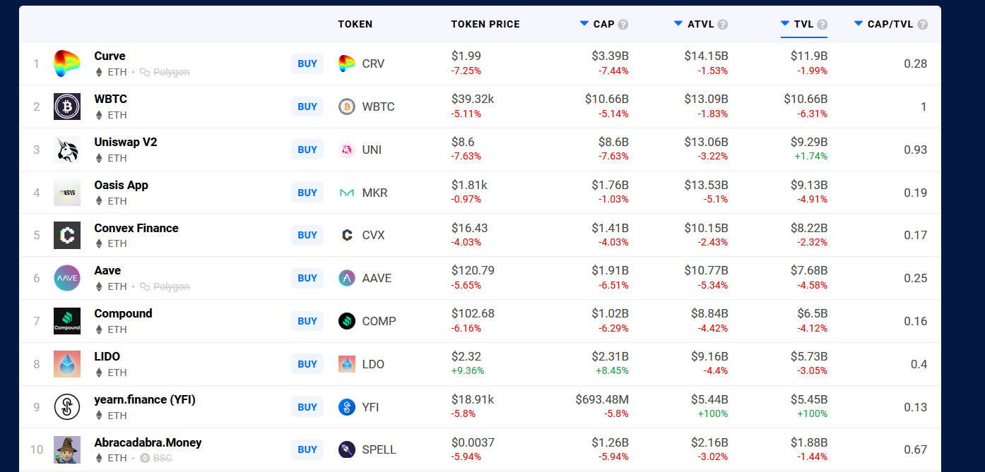 Ethereum-based DeFi too is also suffering too, with eight out of the top 10 projects in all-seeing red over the past month in terms of total value locked (TVL) and native asset token price.