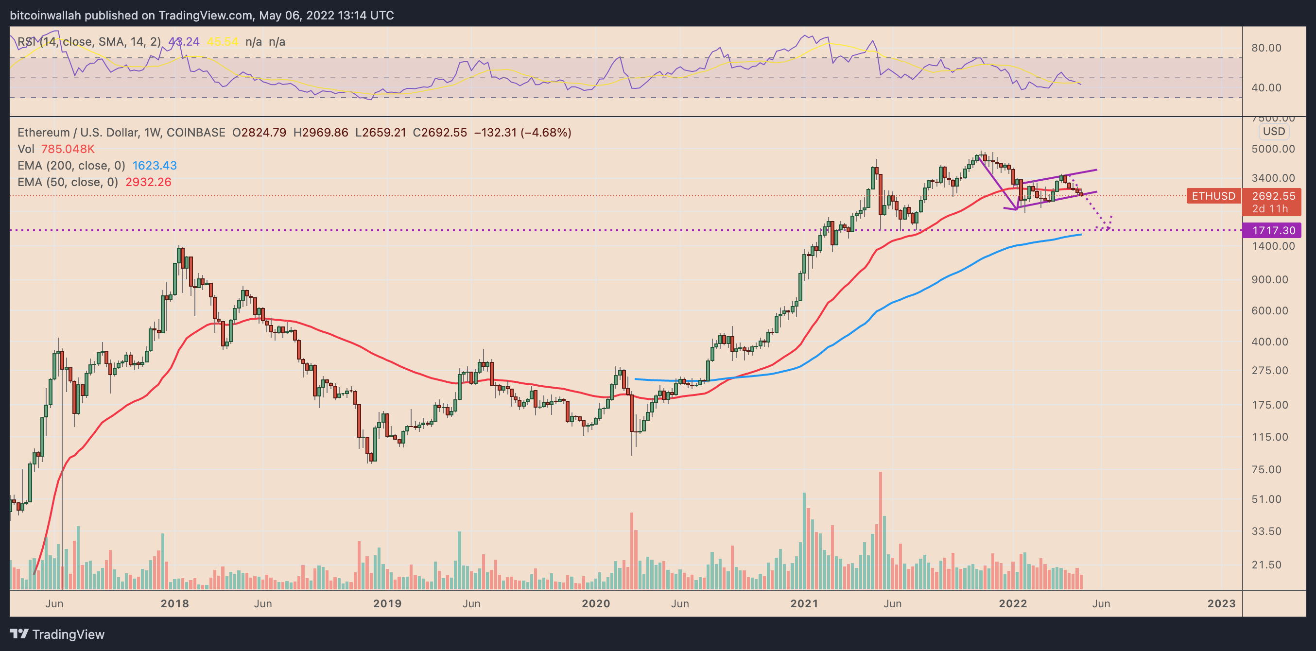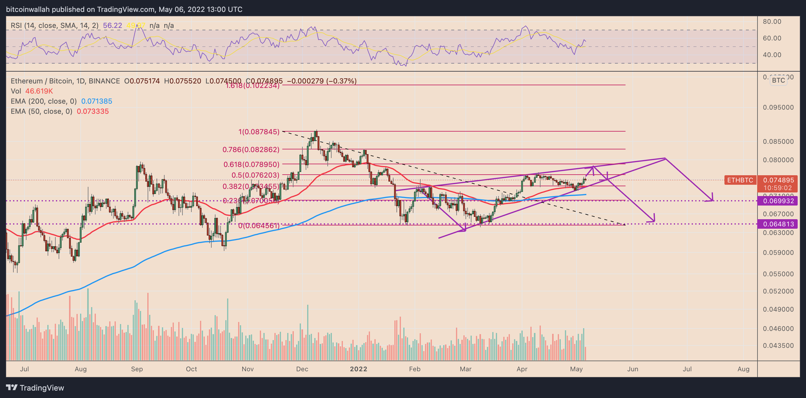 Technicals indicate ETH/BTC could grow further in May but risks a broader correction overall as its trends inside a rising wedge pattern.