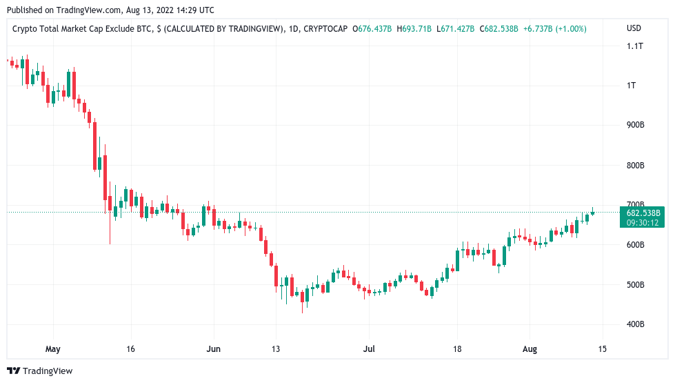 The overall altcoin market cap also reached its highest since the end of May this week, passing $700 billion, according to figures from TradingView and CoinMarketCap.